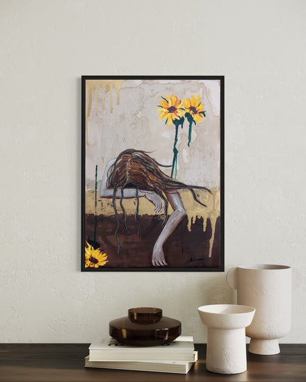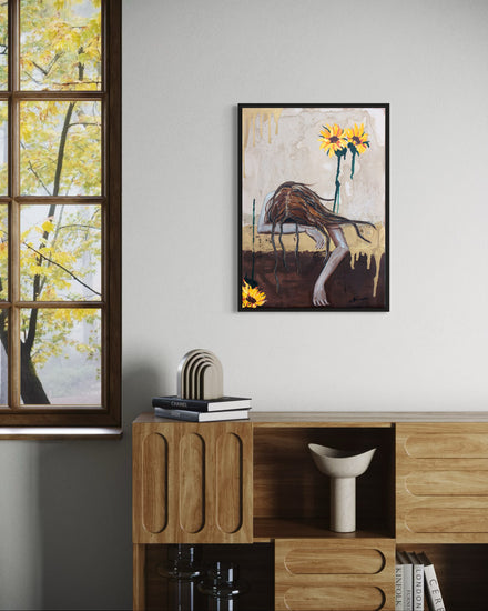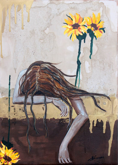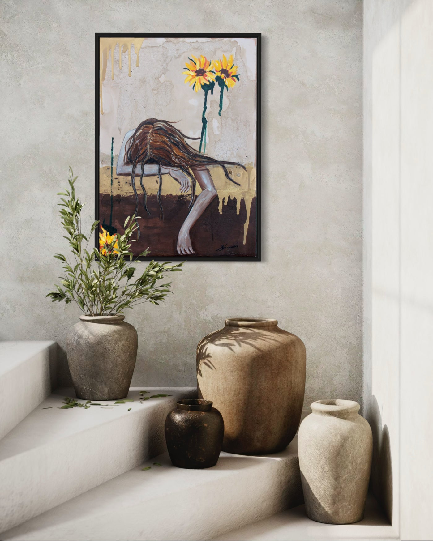 A haunting yet tender image of emotional exhaustion, “Melting Sunflowers” depicts a female figure draped in vulnerability, as bright sunflowers drip downward like memories slipping through time.