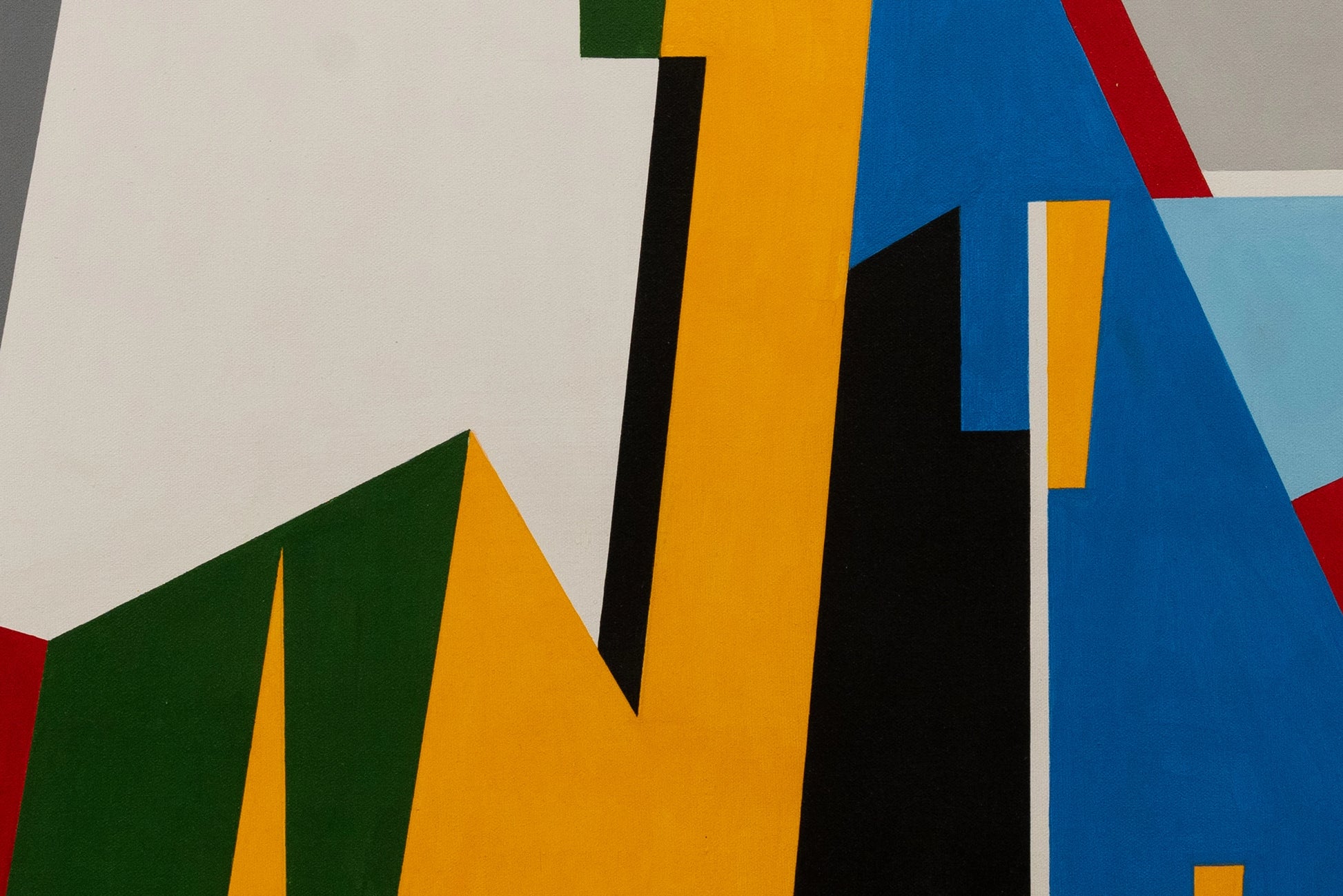 The painting is an abstract composition with a dynamic arrangement of geometric shapes in bold, solid colors. The colors—red, green, blue, yellow, black, white, and grey—are sharply delineated by black lines that create a sense of fragmentation and structure. The background is split into sections of sky blue and light grey, adding to the overall geometric feel. The painting's lack of representational form invites the viewer to interpret the spatial relationships and balance between the shapes and colors. It is signed by the artist in the lower right corner.