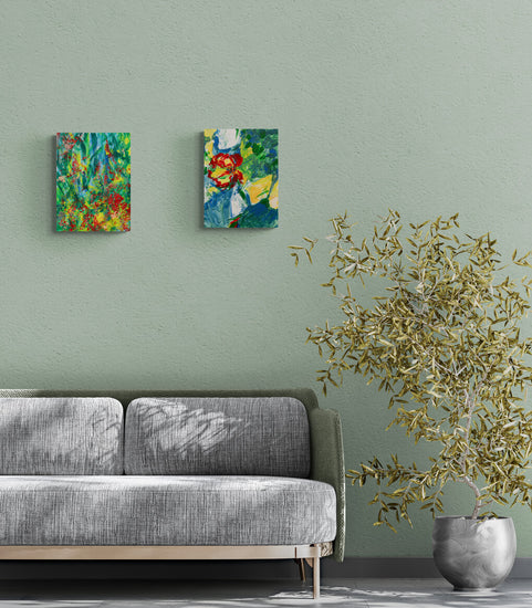 This vibrant abstract painting immerses the viewer in the lush and chaotic beauty of a jungle. Dominated by a rich palette of greens, blues, and splashes of red and yellow, the composition evokes the dense foliage and vibrant flora of a tropical rainforest. The energetic brushstrokes and layered textures create a sense of depth and movement, capturing the wild and untamed spirit of the jungle.