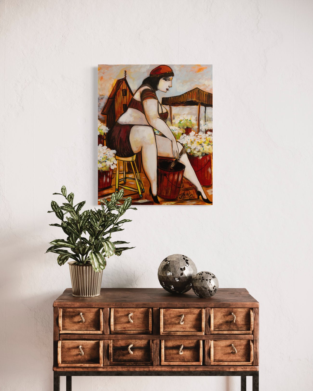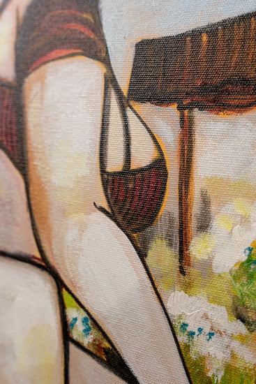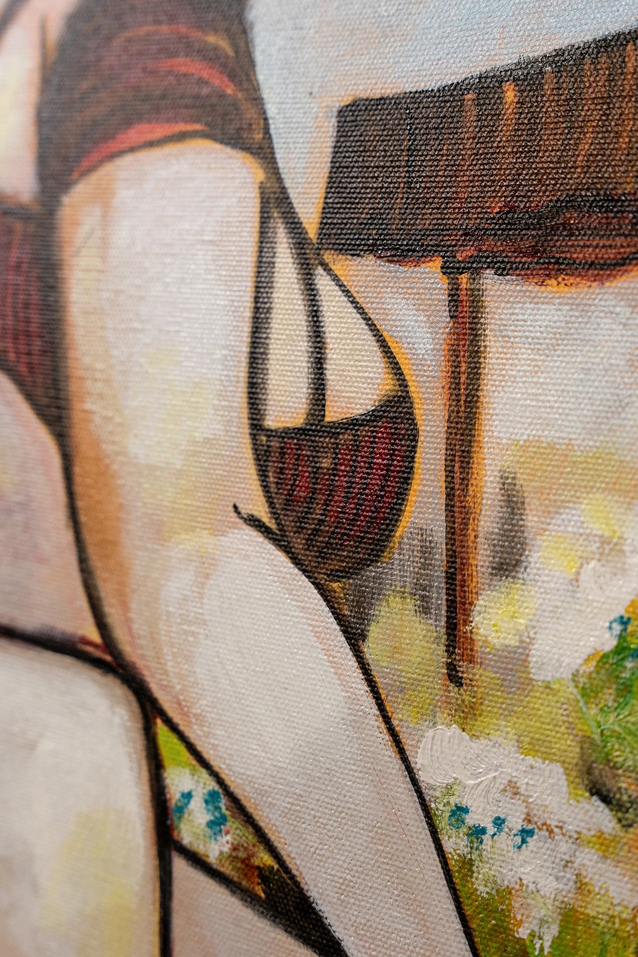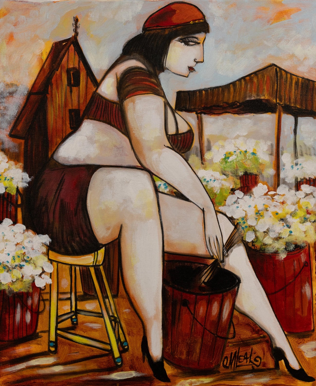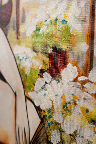 It features a florist in a moment of private contemplation. The figure is abstracted with geometric simplification of forms and a flattened perspective. The color palette is earthy and warm, giving the scene a grounded, intimate atmosphere.