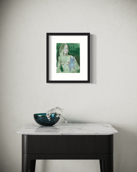 The figure is enveloped by what could be interpreted as wings or perhaps a metaphorical shield, suggesting themes of protection, vulnerability, or transformation. The posture, with the head bowed and the body enclosed by these wing-like forms, enhances the feeling of introspection or perhaps shielding from external forces.