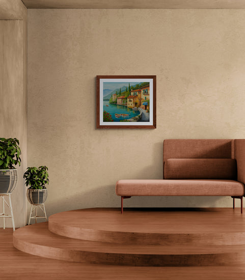 The painting beautifully captures a tranquil lakeside scene with quaint houses, serene waters, and lush greenery under a soft mountain backdrop.