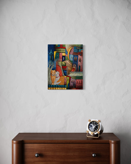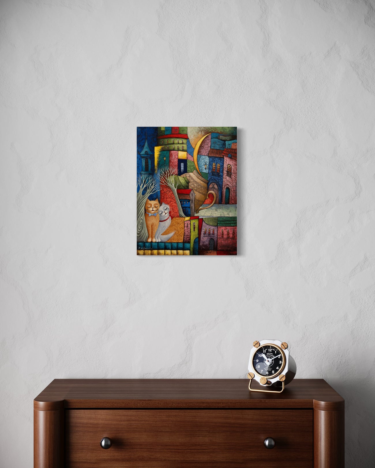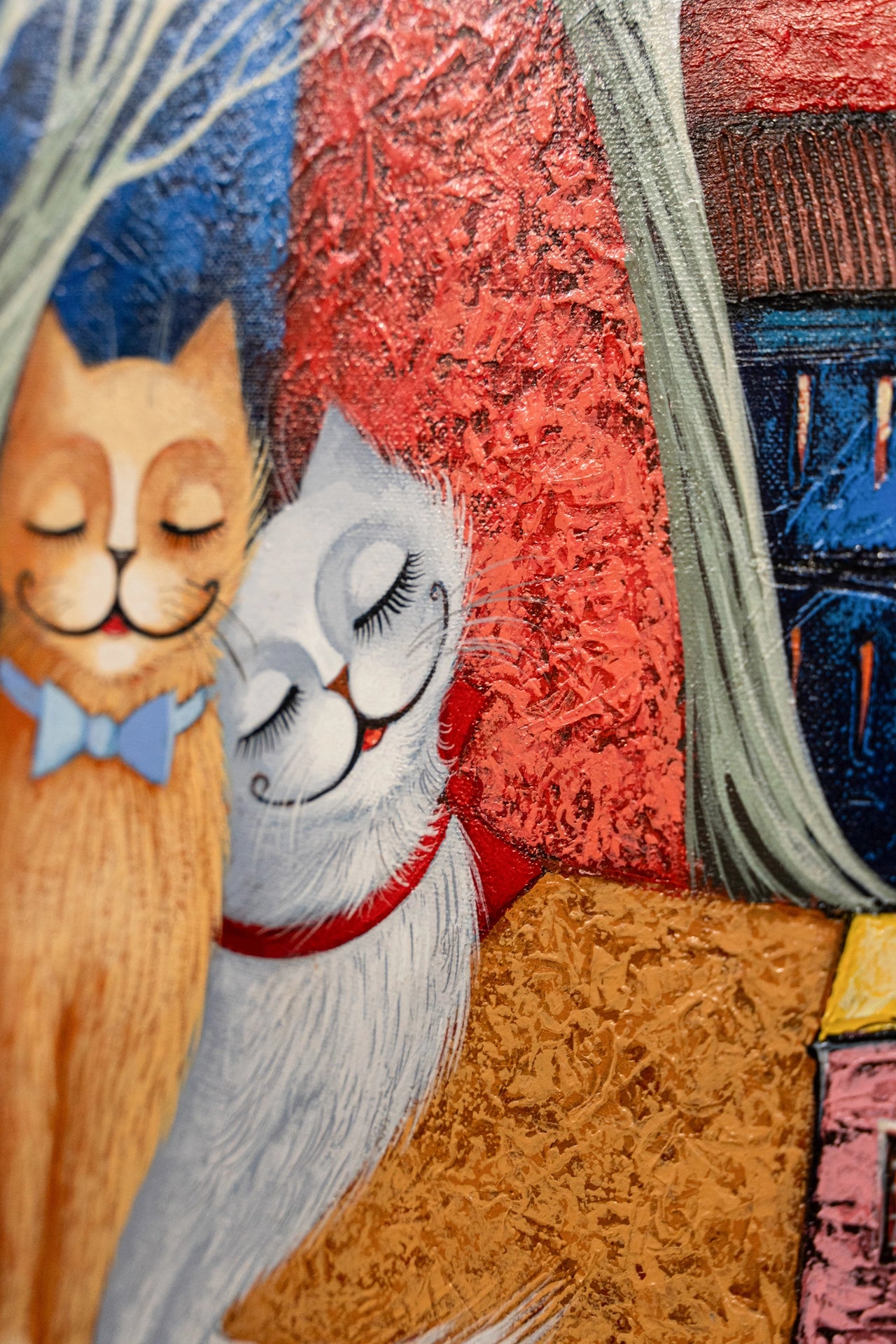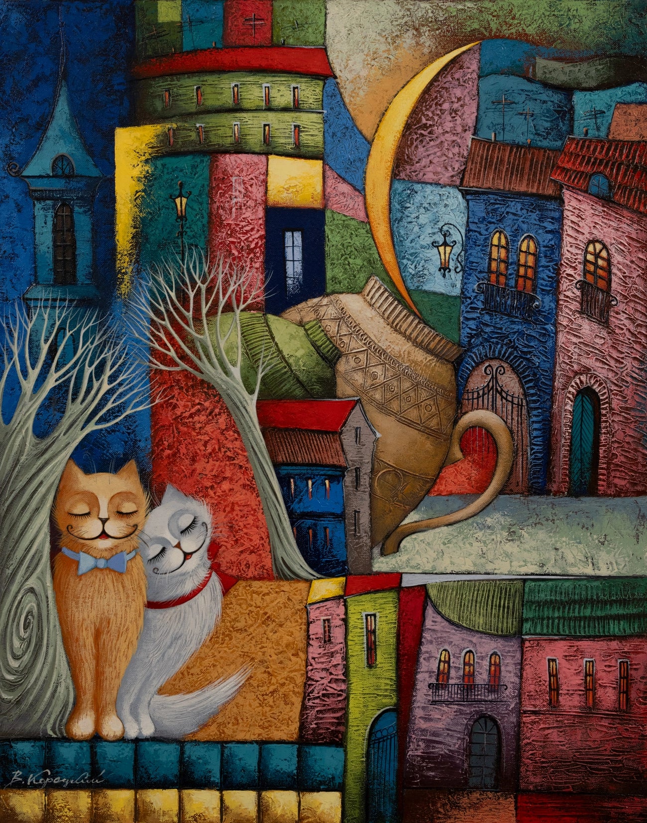 This painting by Vyacheslav Koretsky, features a pair of anthropomorphized cats sitting contently in front of a colorful and texturally rich townscape. The buildings are rendered in a patchwork of vibrant hues, with curving lines and stylized forms that give the impression of a dreamlike village. The nighttime setting is suggested by the deep blue sky and crescent moon, creating a charming and imaginative scene that seems to celebrate love and companionship.