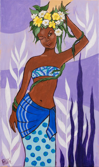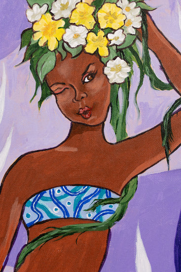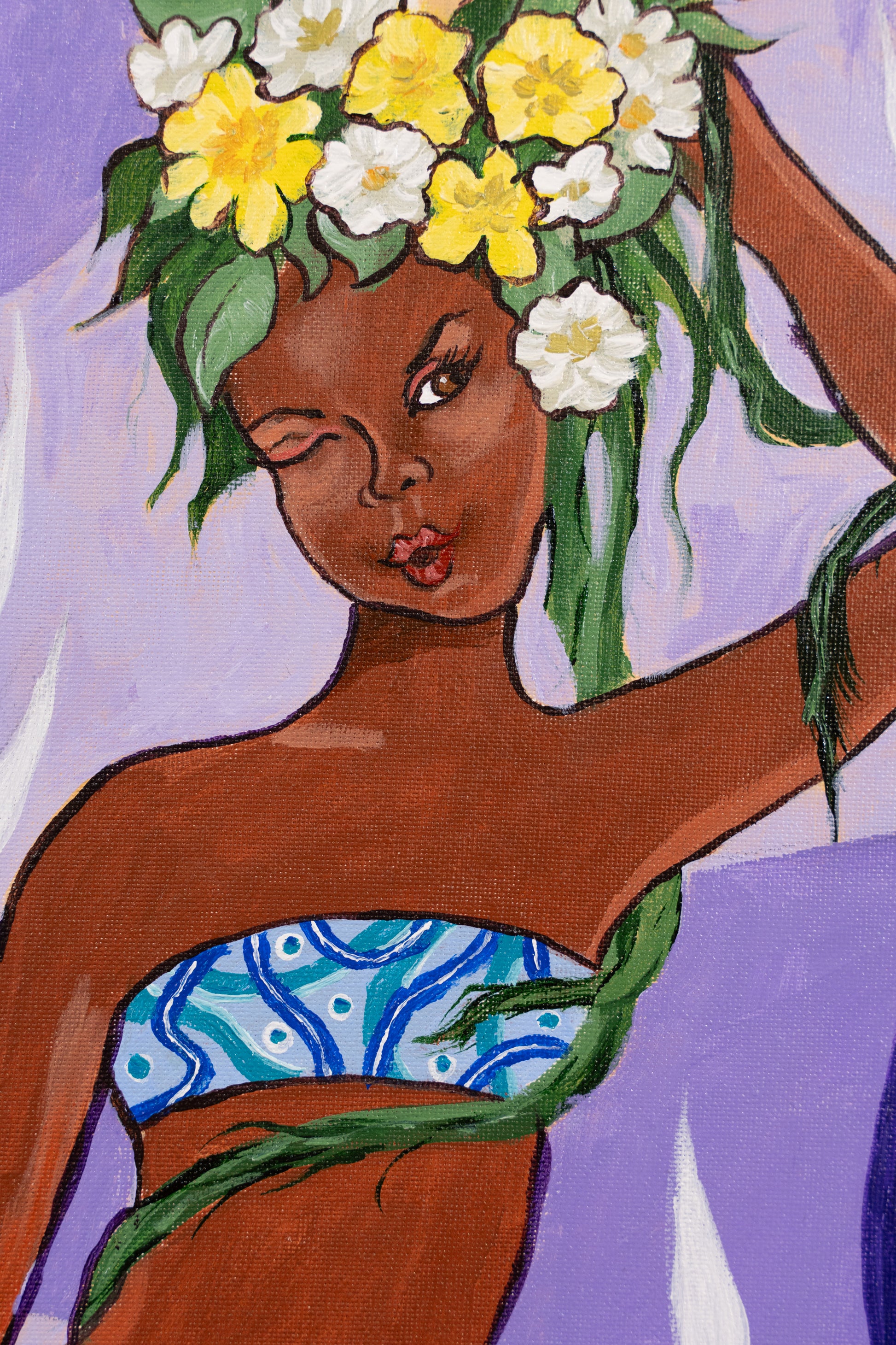 This vibrant artwork features a graceful figure adorned with a crown of fresh blooms, set against a backdrop of purple and white tones. The subject's serene pose and the floral motif create a connection with nature, evoking a sense of peace and femininity. The use of bold colors and distinct outlines, coupled with a stylized portrayal of the human form, contributes to the painting's modern and expressive aesthetic. This piece is a celebration of cultural identity and natural beauty, blending traditional elements with contemporary art styles.This vibrant artwork features a graceful figure adorned with a crown of fresh blooms, set against a backdrop of purple and white tones. The subject's serene pose and the floral motif create a connection with nature, evoking a sense of peace and femininity. The use of bold colors and distinct outlines, coupled with a stylized portrayal of the human form, contributes to the painting's modern and expressive aesthetic. This piece is a celebration of cultural identity and natural beauty, blending traditional elements with contemporary art styles.