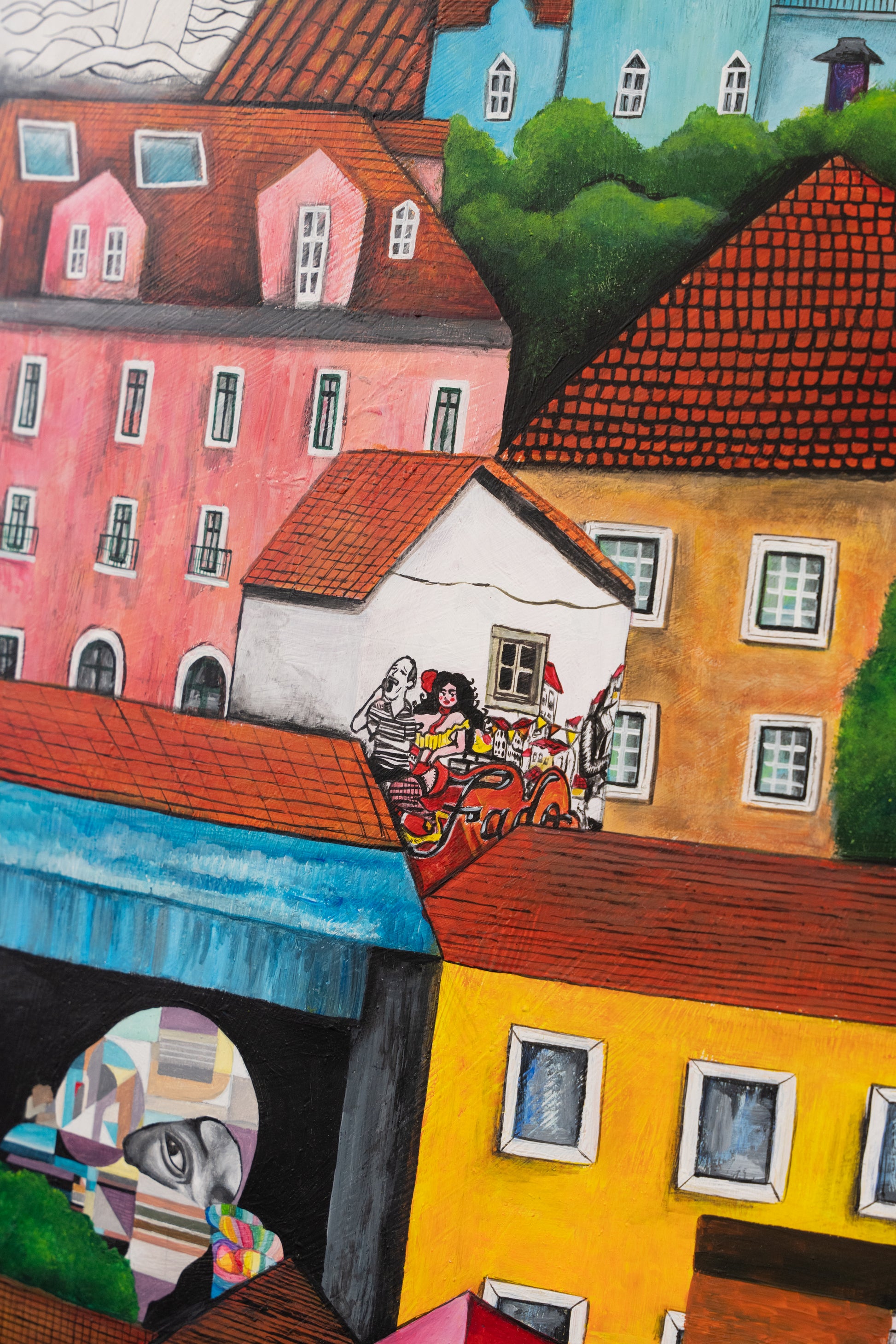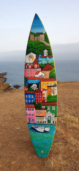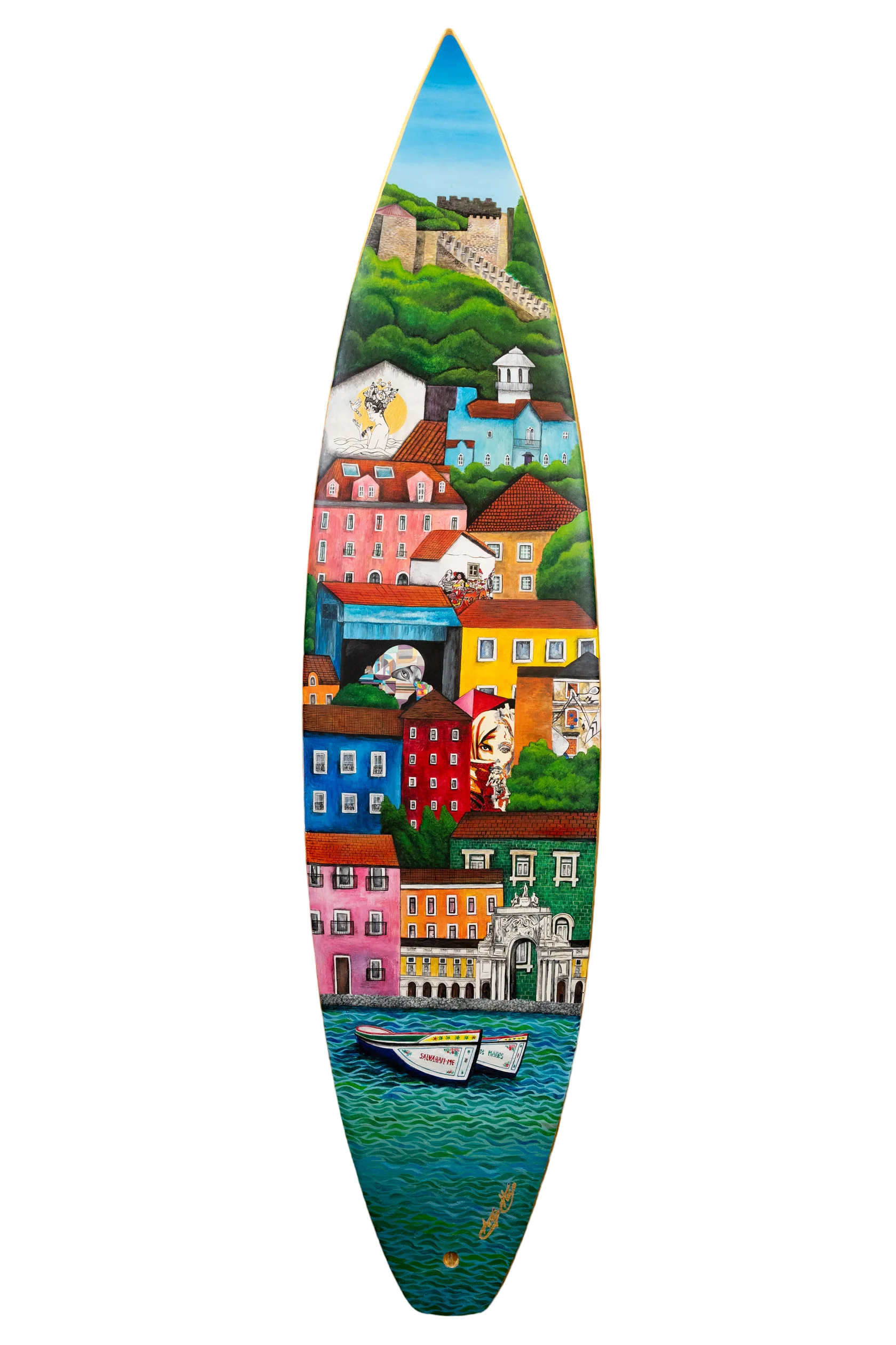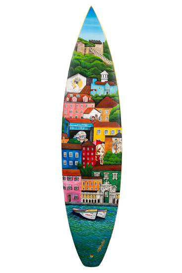 This surfboard artwork features a vivid, stylized representation of Lisbon landscape. Buildings in various colors and designs are painted, each representing different architectural styles.