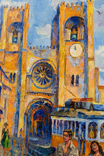 This painting captures the vibrant, bustling atmosphere of Lisbon with a lively depiction of daily life near a historic tram and the iconic architecture of a church. The use of impasto technique gives the artwork a rich texture that brings the scene to life, with thick, expressive strokes that emphasize the radiant colors of the buildings and the sky. Each figure is portrayed with a sense of movement and individuality, adding a human element that invites viewers to immerse themselves in this vivid urban landscape. The overall composition, with its bold colors and dynamic forms, celebrates the beauty and energy of Lisbon.