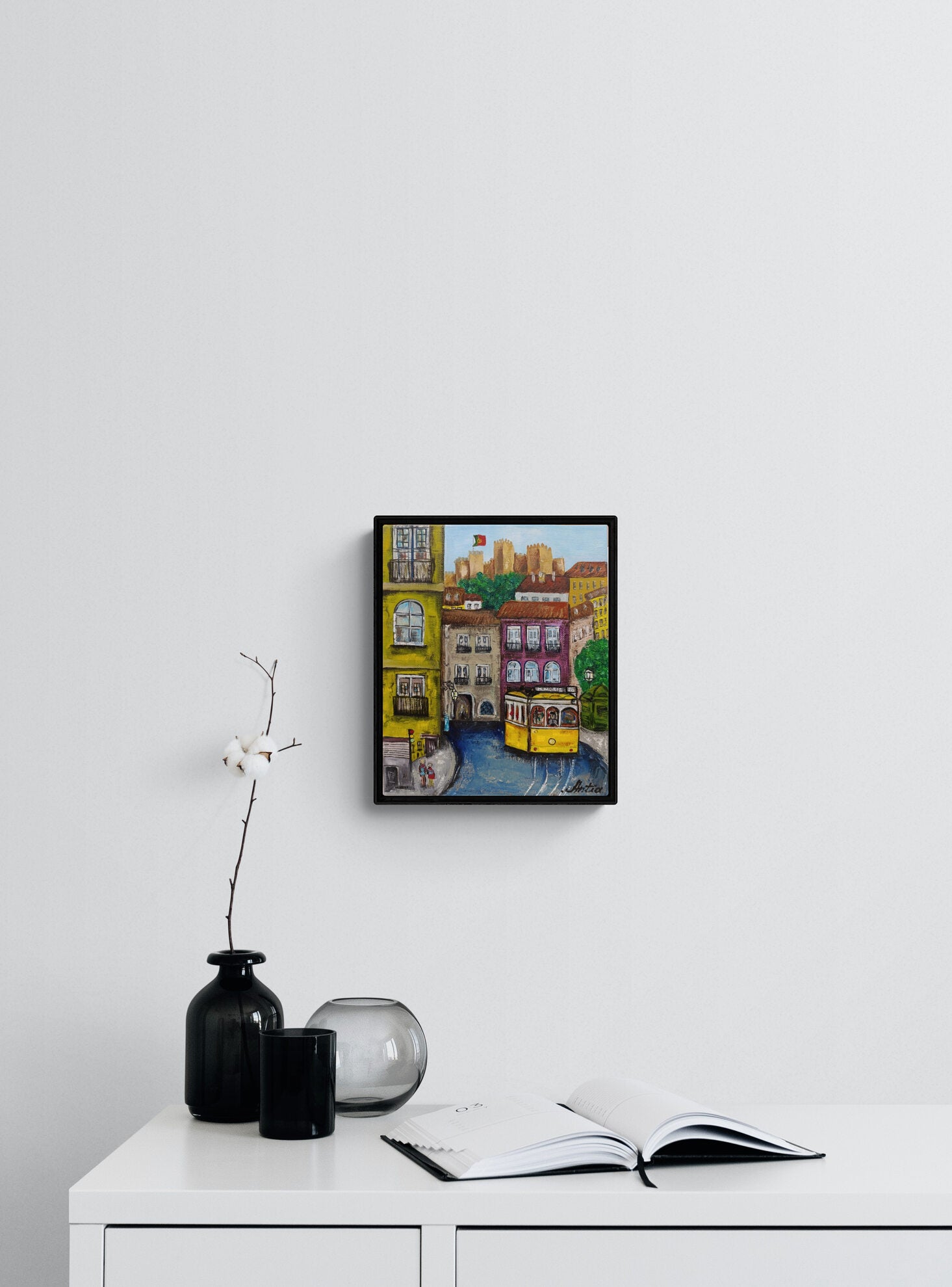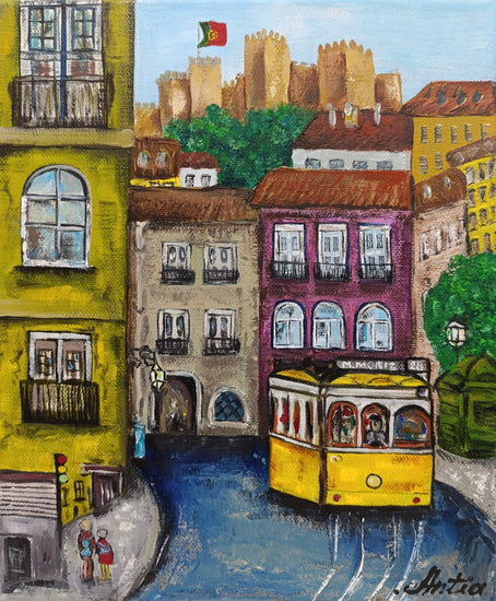 This colorful oil painting captures the charm of Lisbon, Portugal, featuring one of the city's iconic yellow trams. The background showcases traditional pastel-hued buildings, topped with the grand São Jorge Castle, proudly flying the Portuguese flag. The tram, marked with route number 28, rolls along the vibrant streets, surrounded by the unique architecture that defines Lisbon. The artist uses vibrant colors and a somewhat simplified, playful approach to create a lively atmosphere. This piece is a delightful celebration of city life, with the tram as a symbol of Lisbon’s character and history. The naïve art style brings a certain innocence to the scene, focusing more on the overall feel rather than intricate detail, enhancing its nostalgic quality.