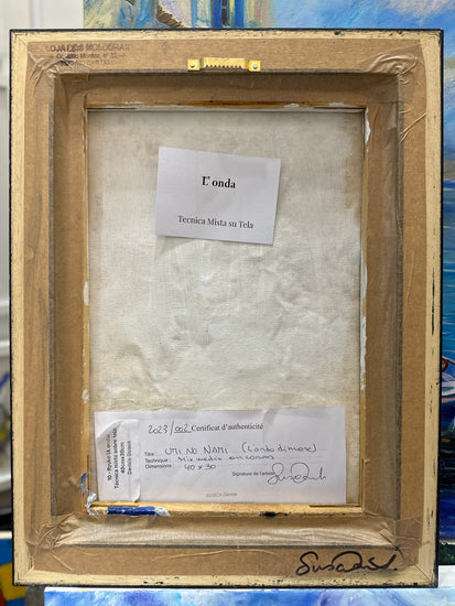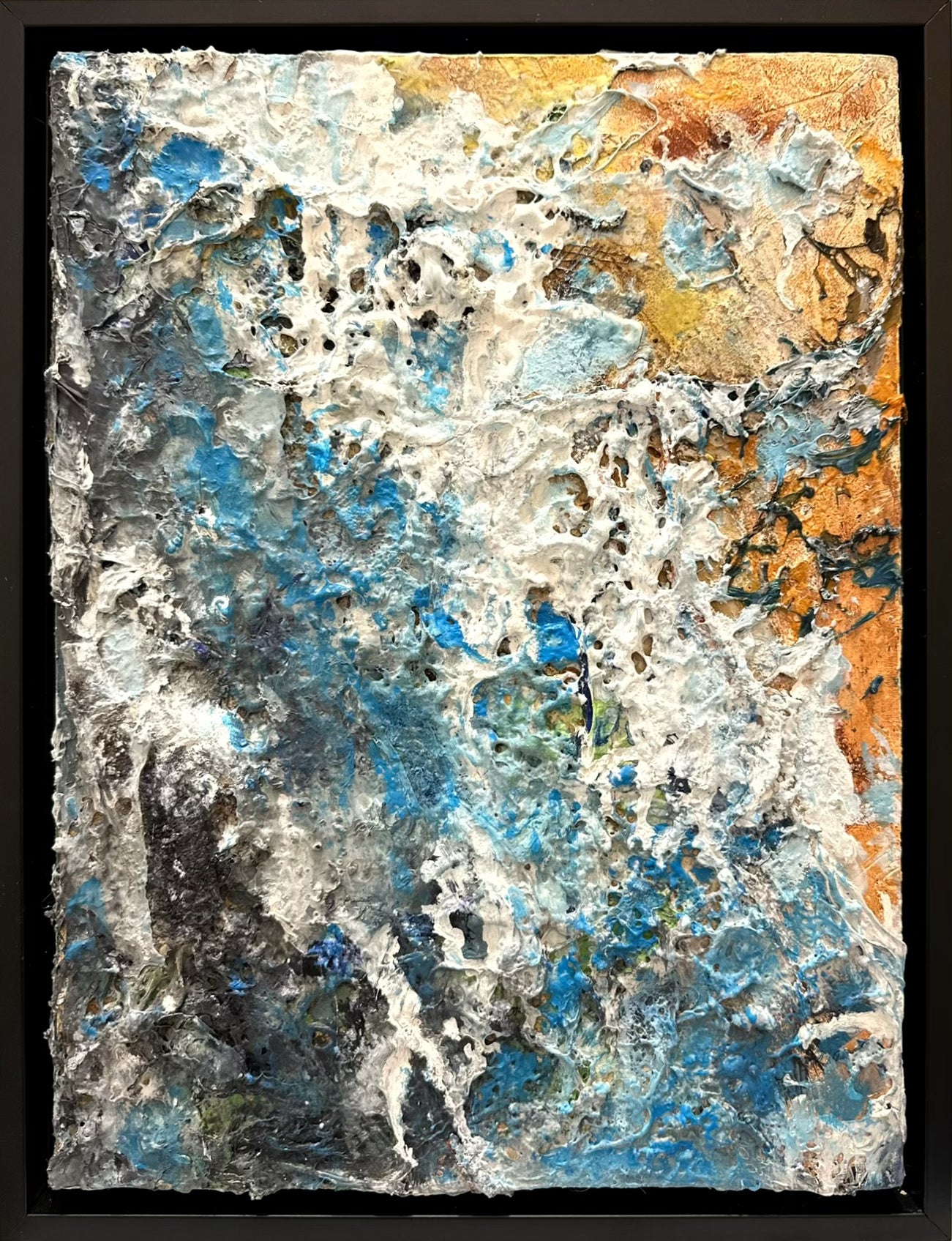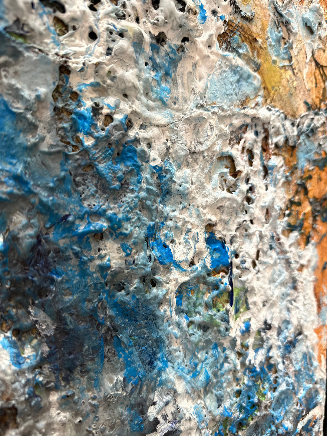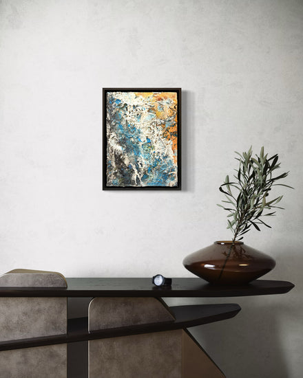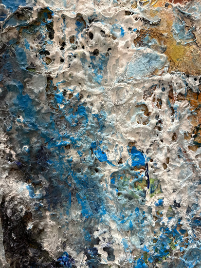 An abstract piece that conveys a sense of both serenity and chaos through its intricate texture and color composition. The painting features cool blues and whites clashing with warm, earthy tones, creating a contrast that suggests the meeting of different elements—perhaps water and earth.