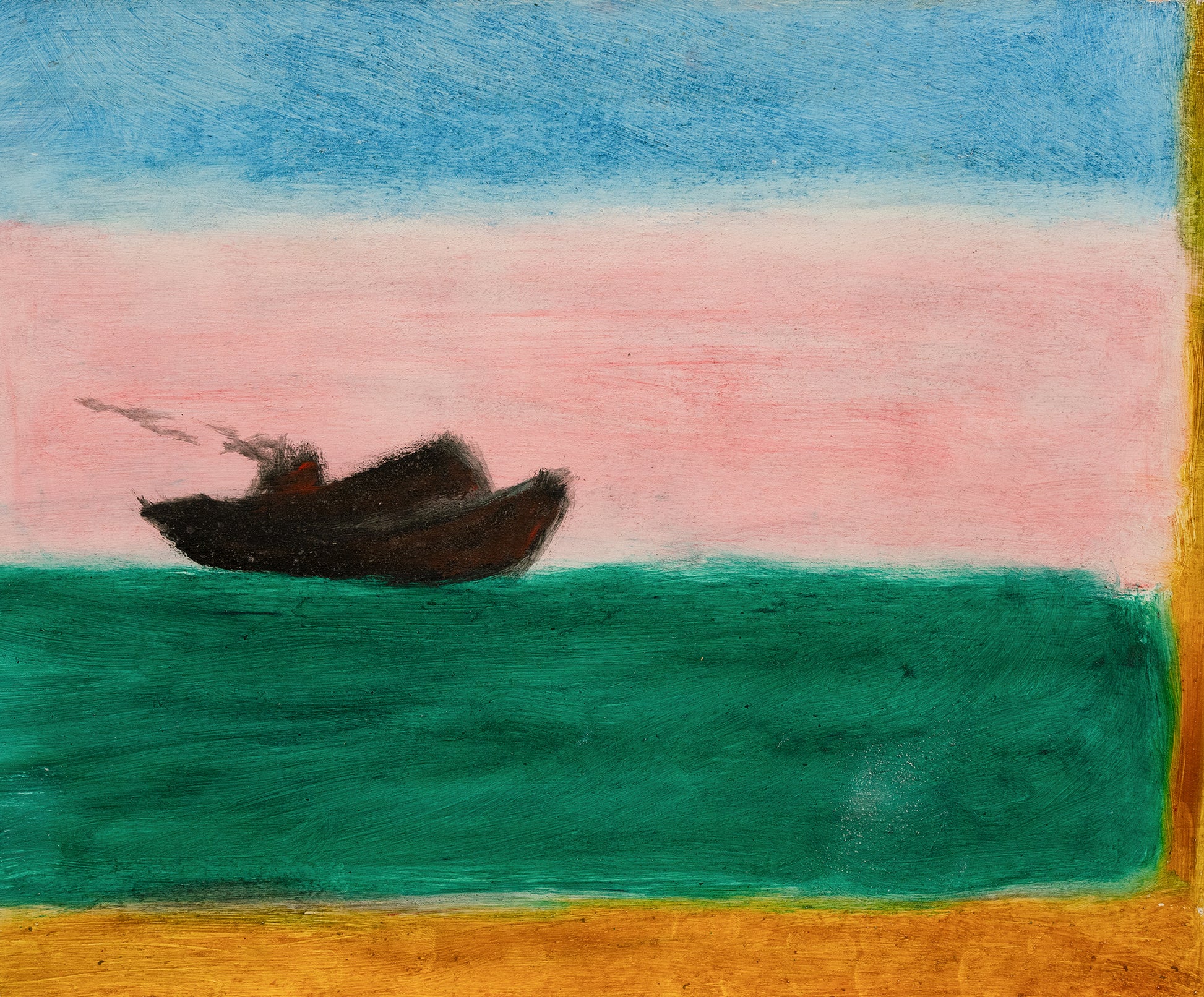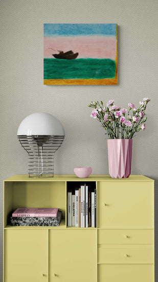 A solitary boat sails across a tranquil sea, set against a serene sky. The soft pastel colors and simple composition evoke a sense of calm and introspection, capturing the quiet beauty of a solitary journey.