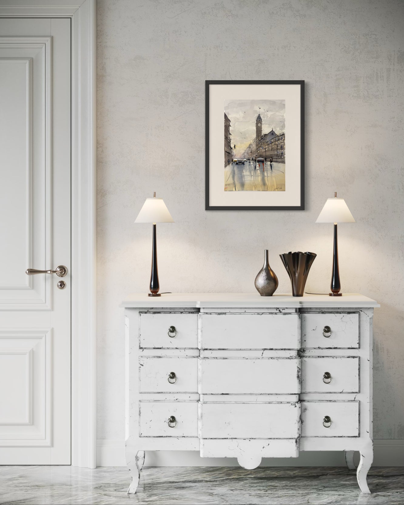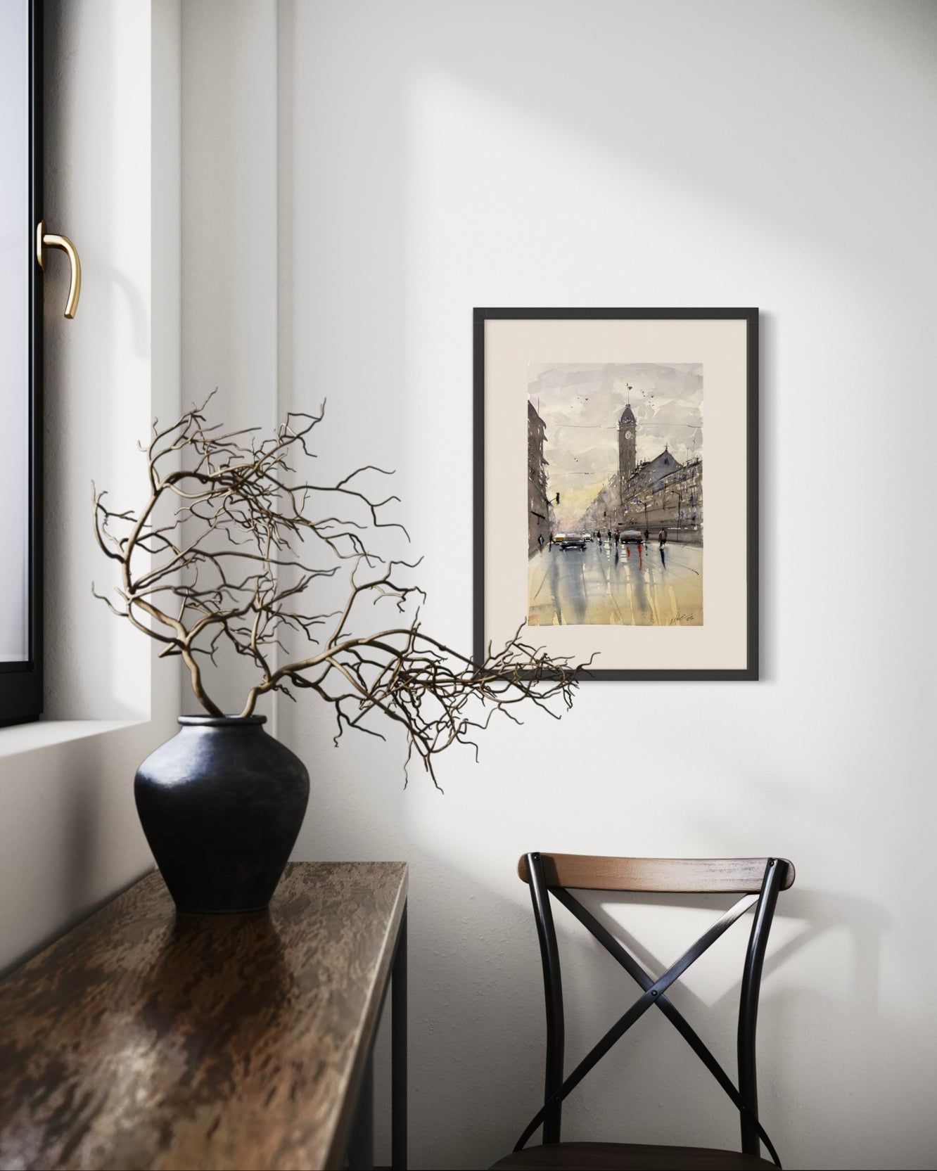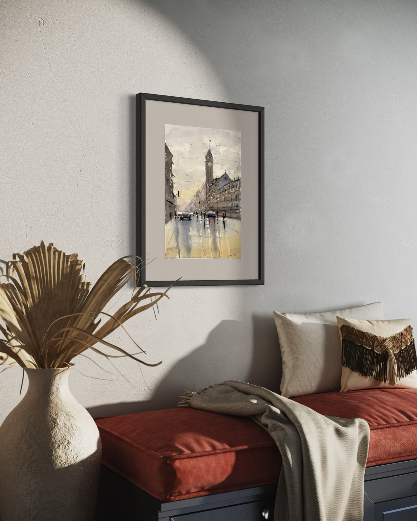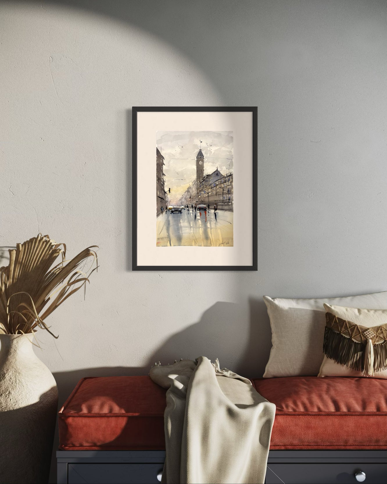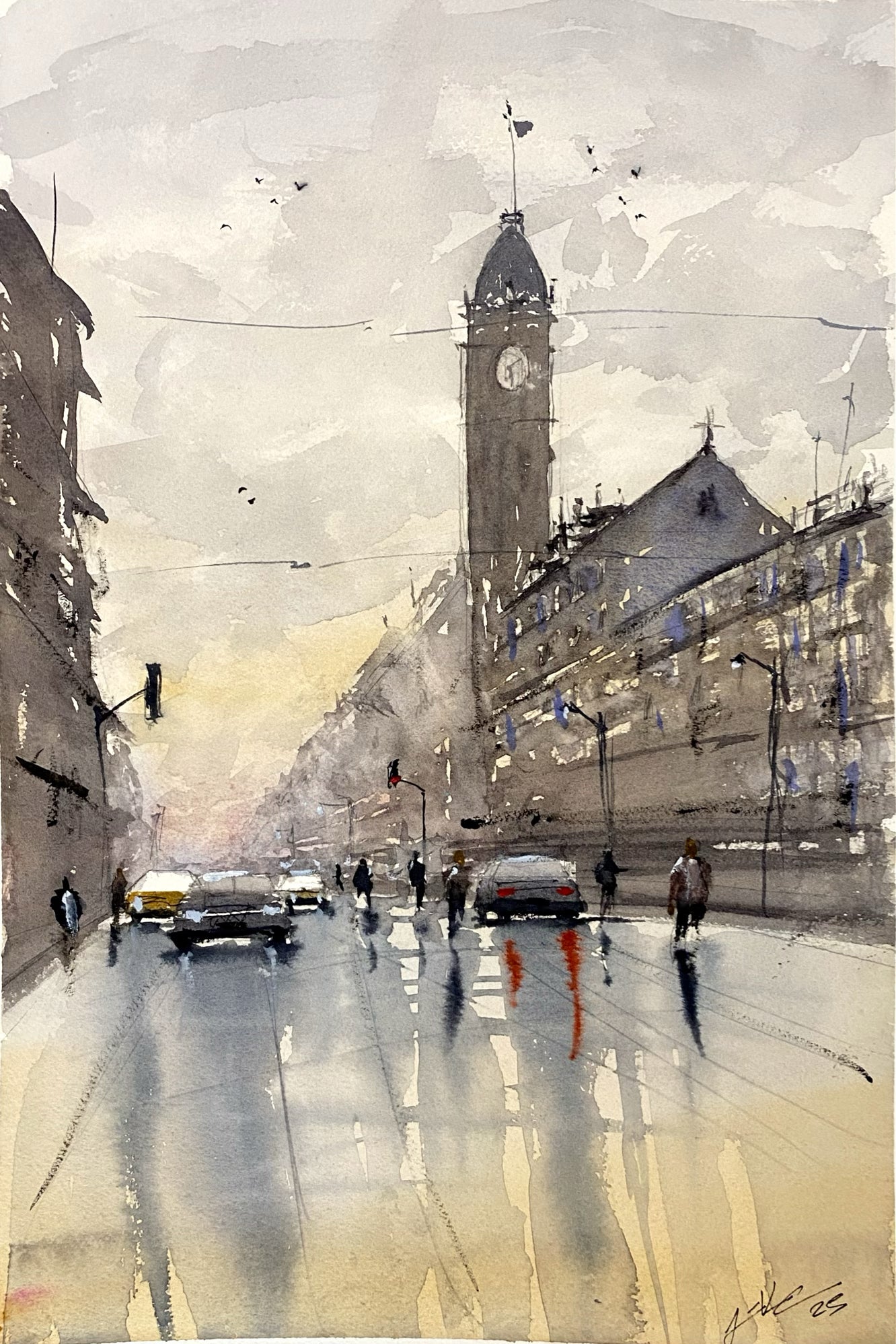 A moody urban morning unfolds under a hazy sky, where reflections shimmer on rain-slicked streets and distant figures traverse the quiet avenue. Dominating the scene is a stately clock tower, its silhouette lending a sense of time and place.