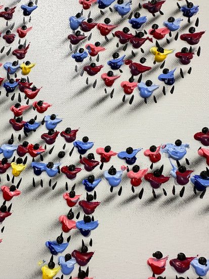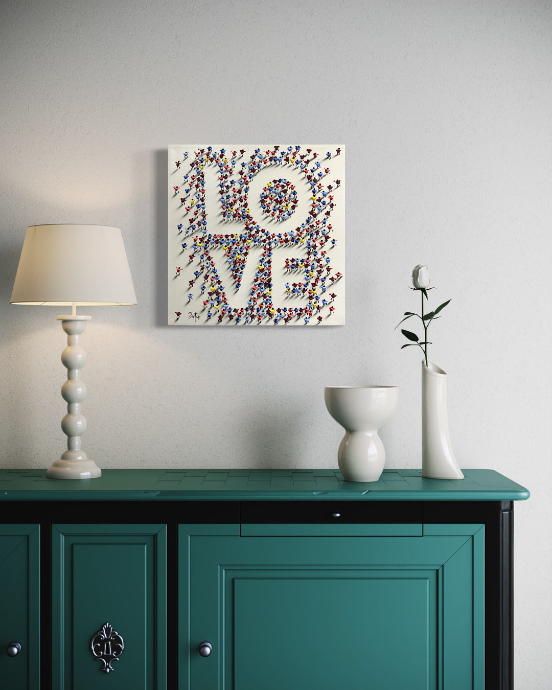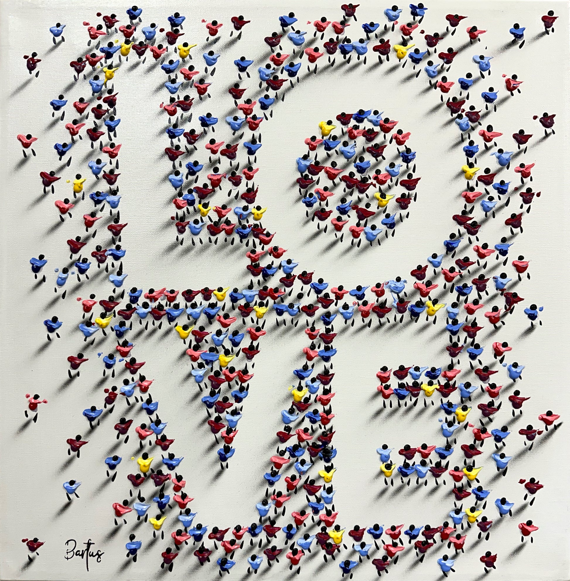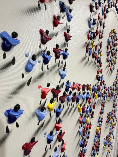 This artwork by Francisco Bartus is a unique and visually captivating piece that combines elements of Pop Art with an innovative, three-dimensional sculptural technique. Unlike traditional painting styles that rely on brushstrokes on canvas, this work features an array of colorful, small figures that protrude from the canvas, creating a dynamic and textured surface. The figures are arranged in such a way that they form a larger image, showcasing an inventive approach to creating visual depth and interest.