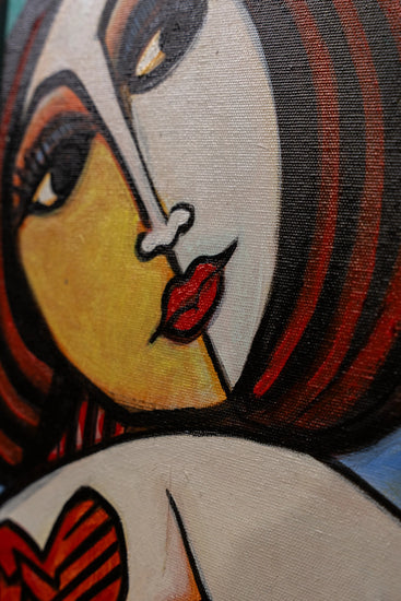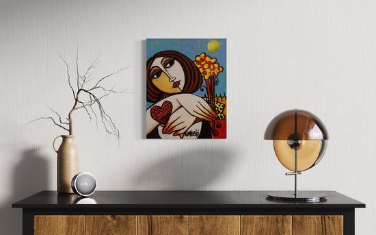This vibrant painting portrays a stylized female figure with large, expressive eyes and a contemplative expression. She holds a striped heart to her chest, suggesting themes of love and introspection. The background is lively, with a whimsical yellow sun and a bouquet of abstract red and yellow flowers adding a joyful ambiance. The bold outlines and the playful interplay of patterns and colors give the piece a lively, graphic quality.