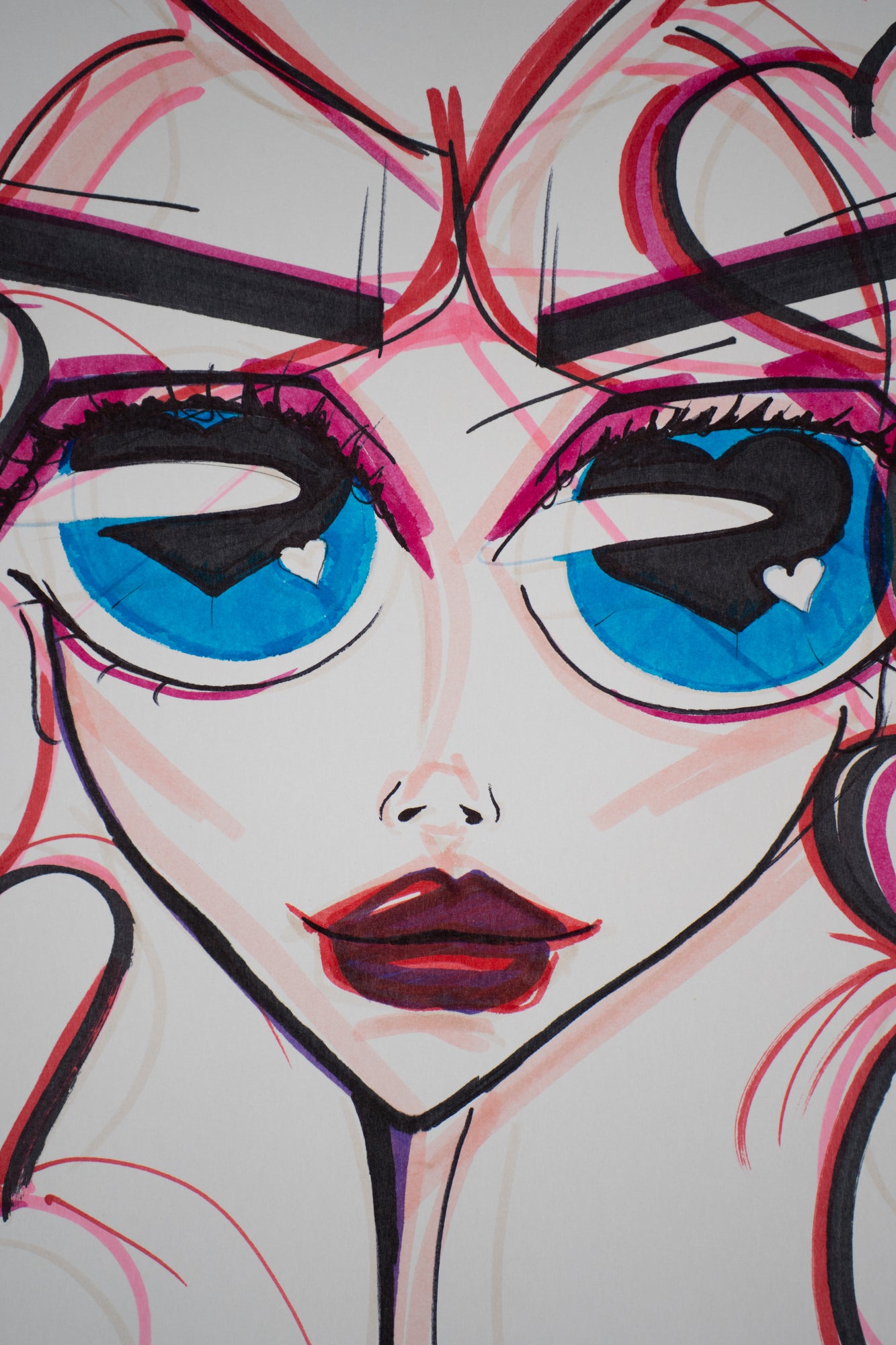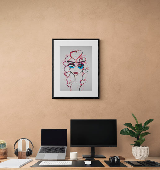 This artwork features an abstract female figure framed by a playful and intricate series of heart shapes forming her hair and hat, with chic sunglasses and luscious lips adding to her glamorous allure.