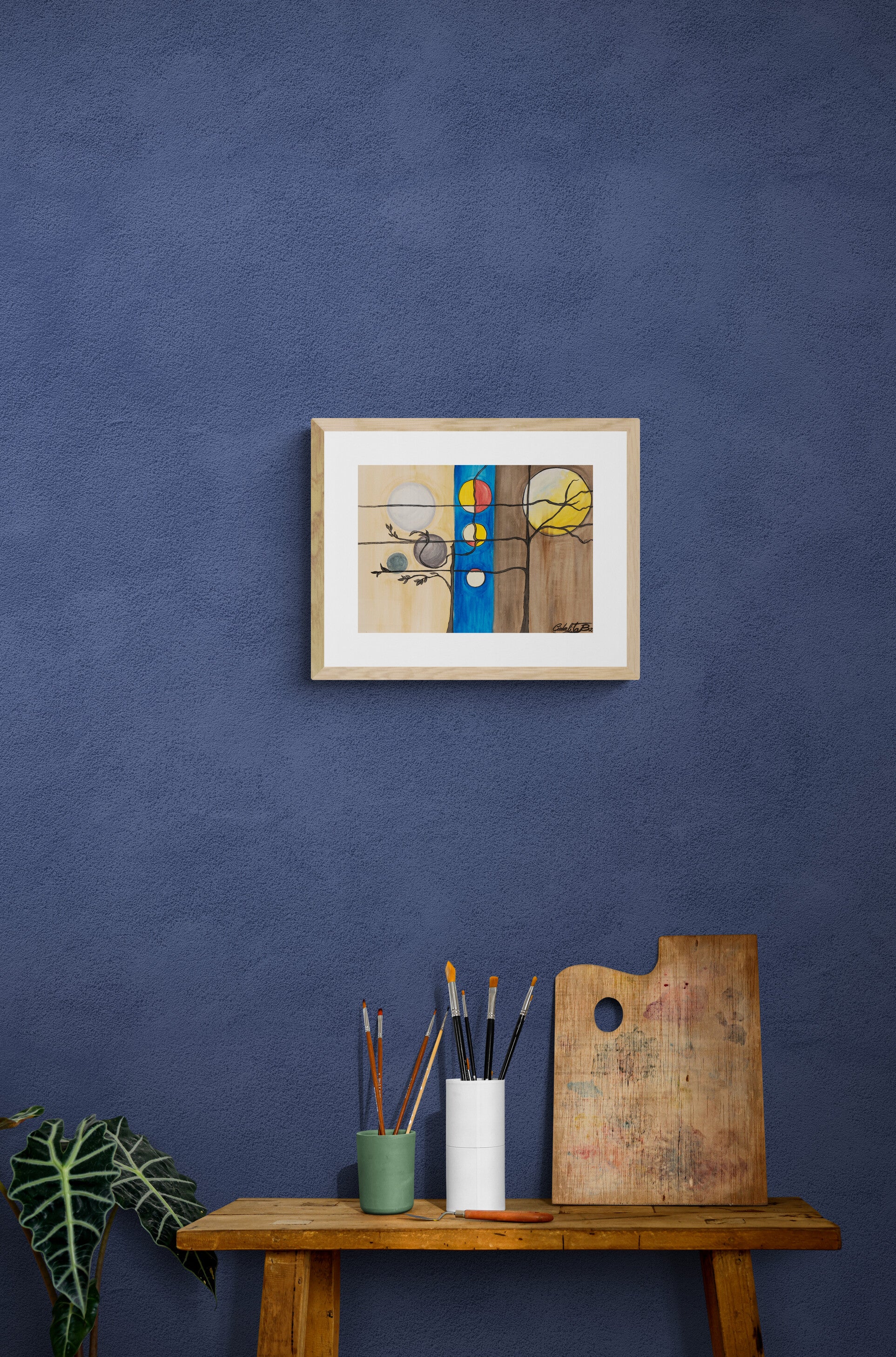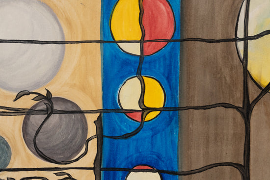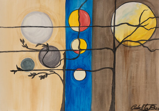 It depicts a series of celestial bodies and abstract elements interconnected by thin, dark lines against a neutral backdrop. The composition reflects the harmony of the universe, portraying a balance between the elements in a simple yet profound manner.
