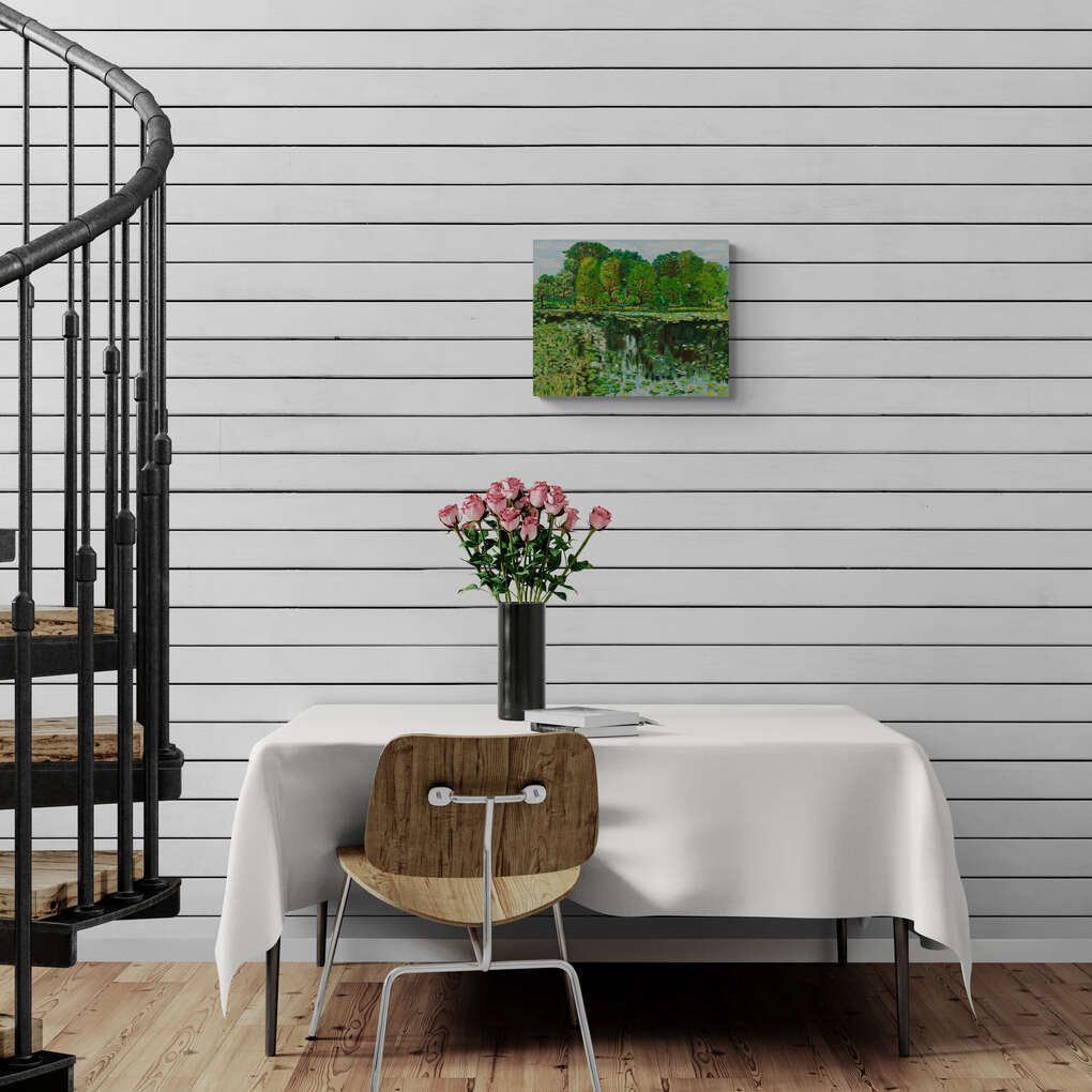 "Lush Oasis" is a vibrant depiction of a tranquil pond surrounded by verdant greenery. The dense foliage and reflective water create a serene and refreshing atmosphere, inviting viewers to immerse themselves in the beauty of nature. The use of rich greens and detailed brushwork brings the scene to life.