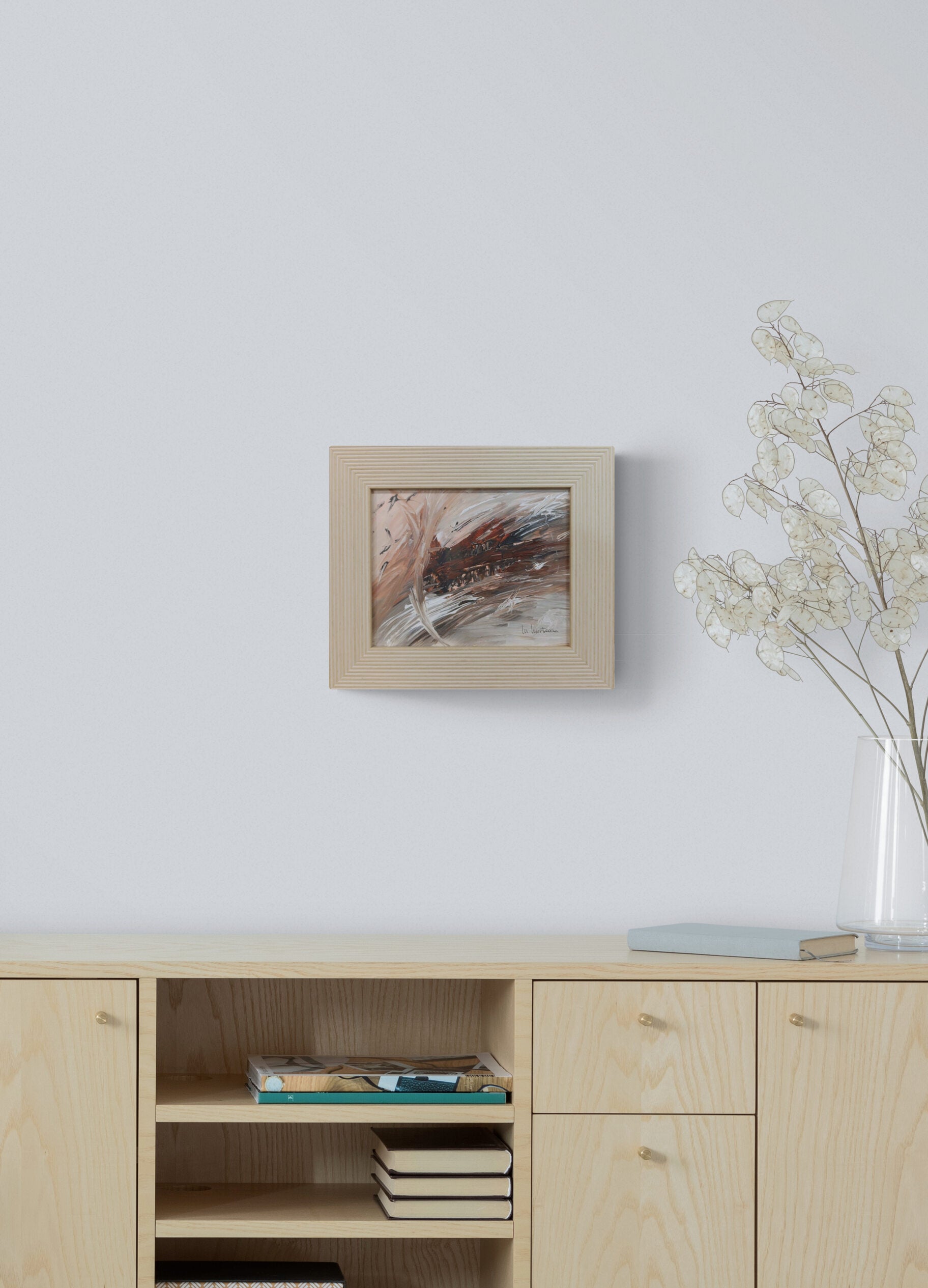 This dynamic abstract painting, titled "Abstract Momentum," showcases an energetic blend of earthy tones and fluid brushstrokes. Mariana Murteira has crafted a scene that captures the essence of movement and chaos. Swirling strokes of brown, black, and white race across the canvas, hinting at natural forces in motion—perhaps wind, storm, or waves. The composition evokes a sense of depth, with the bold layering of colors and textures pulling the viewer's eye through the painting, suggesting both action and tension. The warm palette of browns, contrasted with streaks of lighter whites, gives the piece a grounded yet turbulent atmosphere, inviting the viewer to interpret its rhythm and flow in personal ways.