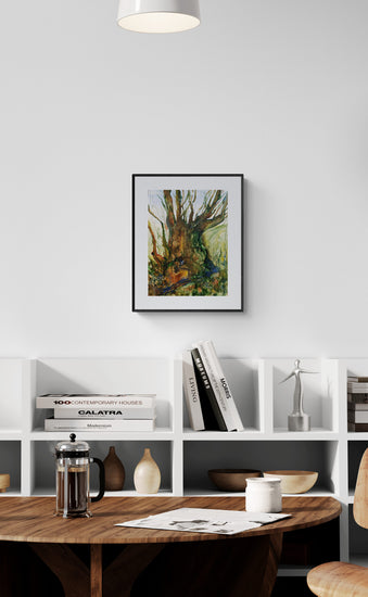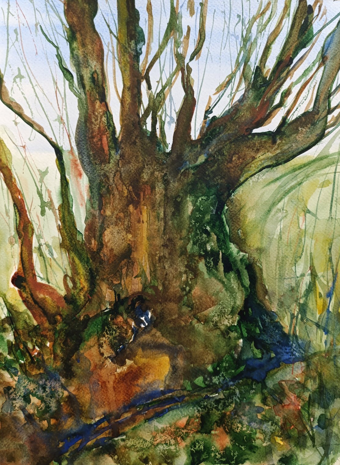 This watercolor painting that portrays the grandeur of an old willow tree with sprawling, twisting branches reaching towards the sky. The trunk, rich with earthy browns and greens, is painted with intricate detail, giving the viewer a sense of the tree's age and wisdom. The delicate, slender branches evoke a feeling of movement, as if swaying gently in the wind. The blending of greens, blues, and warm earthy tones creates a serene, natural atmosphere that invites the viewer to reflect on the beauty and resilience of nature. This piece captures both the strength and grace of the willow tree.