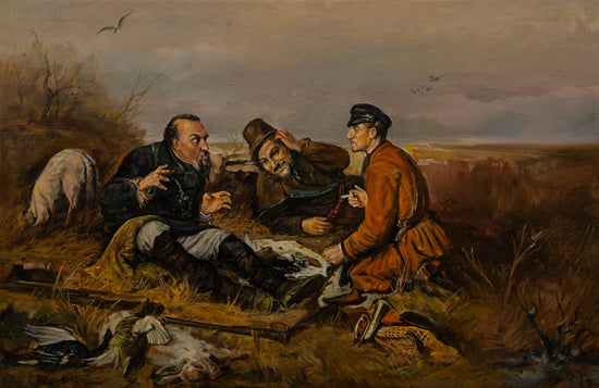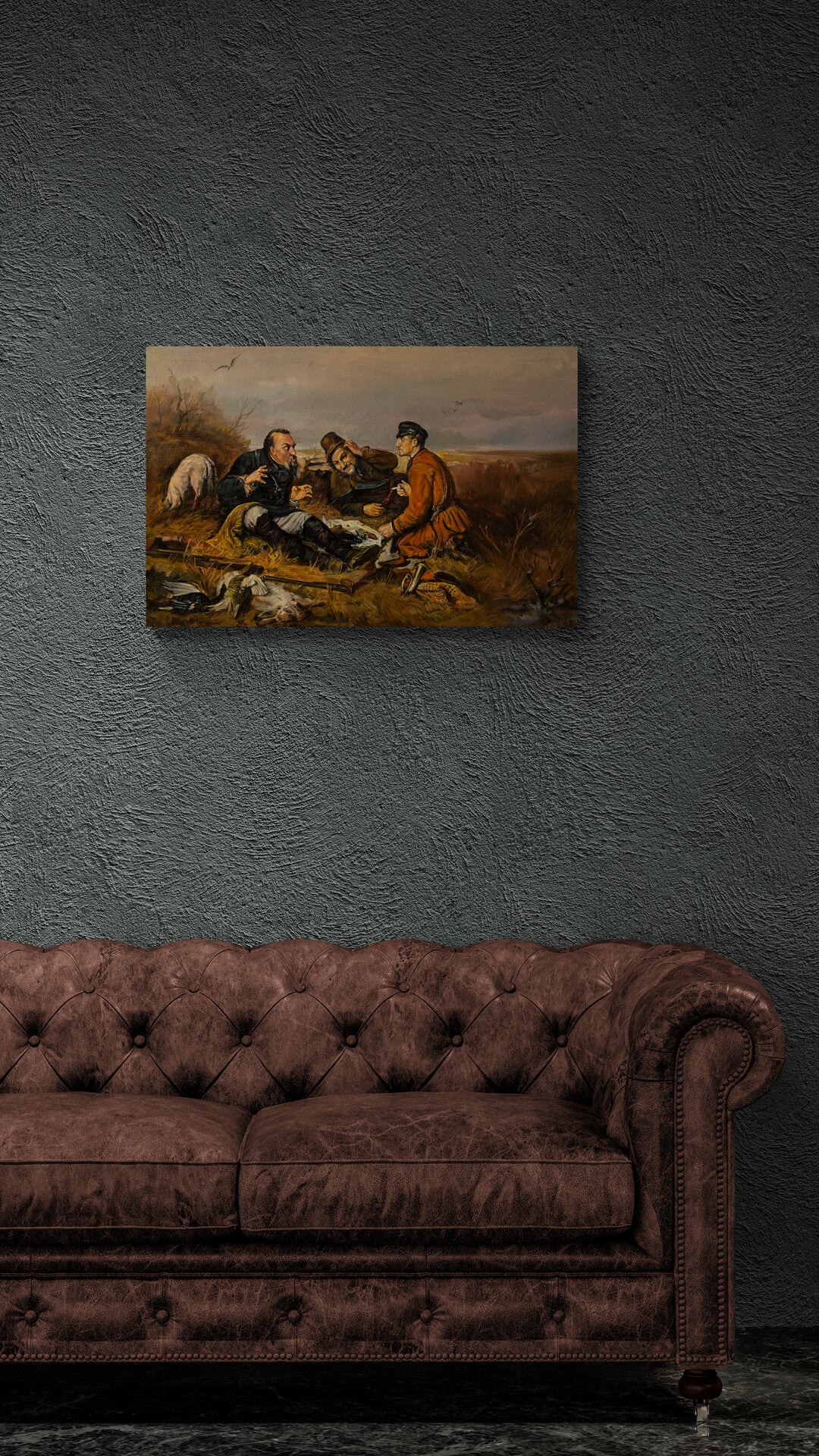 The painting shows a detailed depiction of hunters sharing a moment of camaraderie in a natural setting, surrounded by the fruits of their hunt, aligns well with Perov's thematic focus on the everyday life and character of the Russian people.