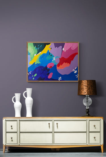This abstract painting offers a dynamic interplay of bold shapes and fluid forms, evoking a sense of movement and energy. Vivid patches of green, yellow, blue, and purple harmonize with softer pinks and reds, while white accents provide contrast and balance. The organic shapes and flowing lines give the impression of a journey through an otherworldly landscape, where forms dissolve into one another, inviting viewers to interpret the meaning. This painting allows for personal reflection and emotional connection, making it a compelling centerpiece for any space.