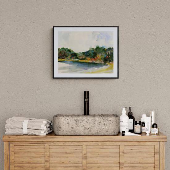 A peaceful watercolor landscape that depicts the soft beauty of a lakeside scene. The painting captures the gentle curve of the shoreline, with lush greenery and hints of fall colors in the foliage. The artist uses soft, flowing brushstrokes to create a sense of serenity and movement, as the reflections of the trees blend into the water. The open sky above adds to the feeling of calmness and expansiveness, allowing the viewer to imagine standing by the water on a quiet day. This artwork embodies the peacefulness of nature in a minimalist and tranquil composition.