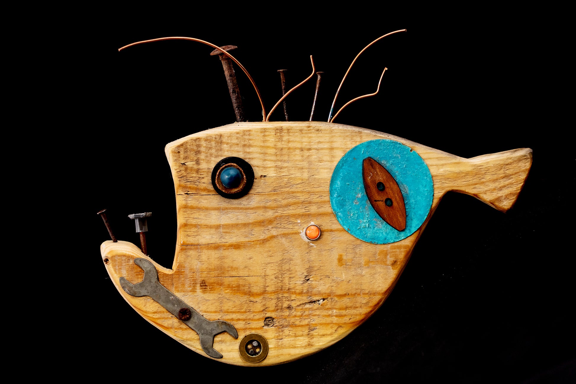 This sculpture combines the organic warmth of wood with cold, industrial elements to create a whimsical fish with a captivating mechanical eye. The creative use of mixed materials and the inventive form invite viewers to explore the boundaries between natural and man-made.