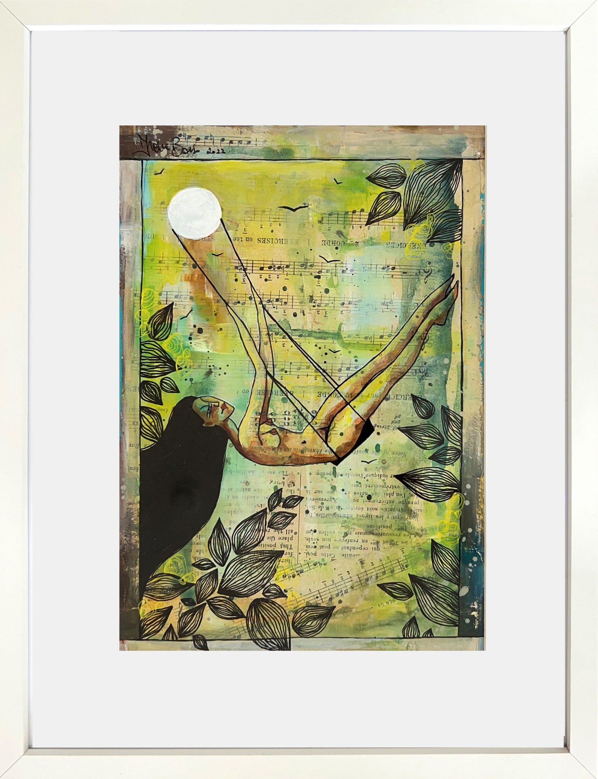 At the heart of this magical scene is the dancer, a being not bound by the laws of gravity, whose limbs stretch gracefully towards the unseen, guided by the rhythms of an otherworldly tune. Cloaked in shadows, the dancer moves in a space where light and darkness meld, a testament to the balance of existence. The moon, a luminous sentinel, casts its gentle glow upon them, connecting the dancer to the celestial bodies with invisible threads, perhaps suggesting that every movement is guided by the stars.