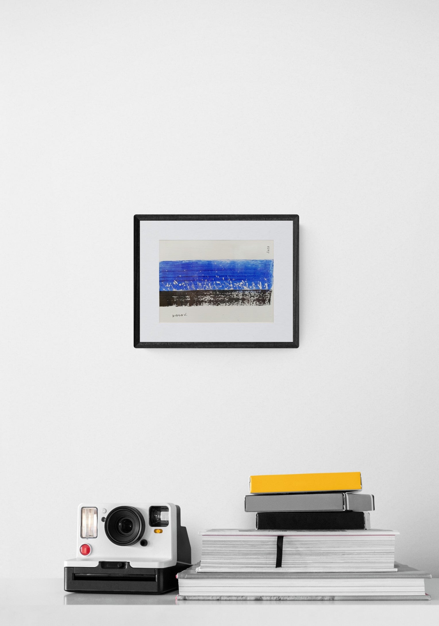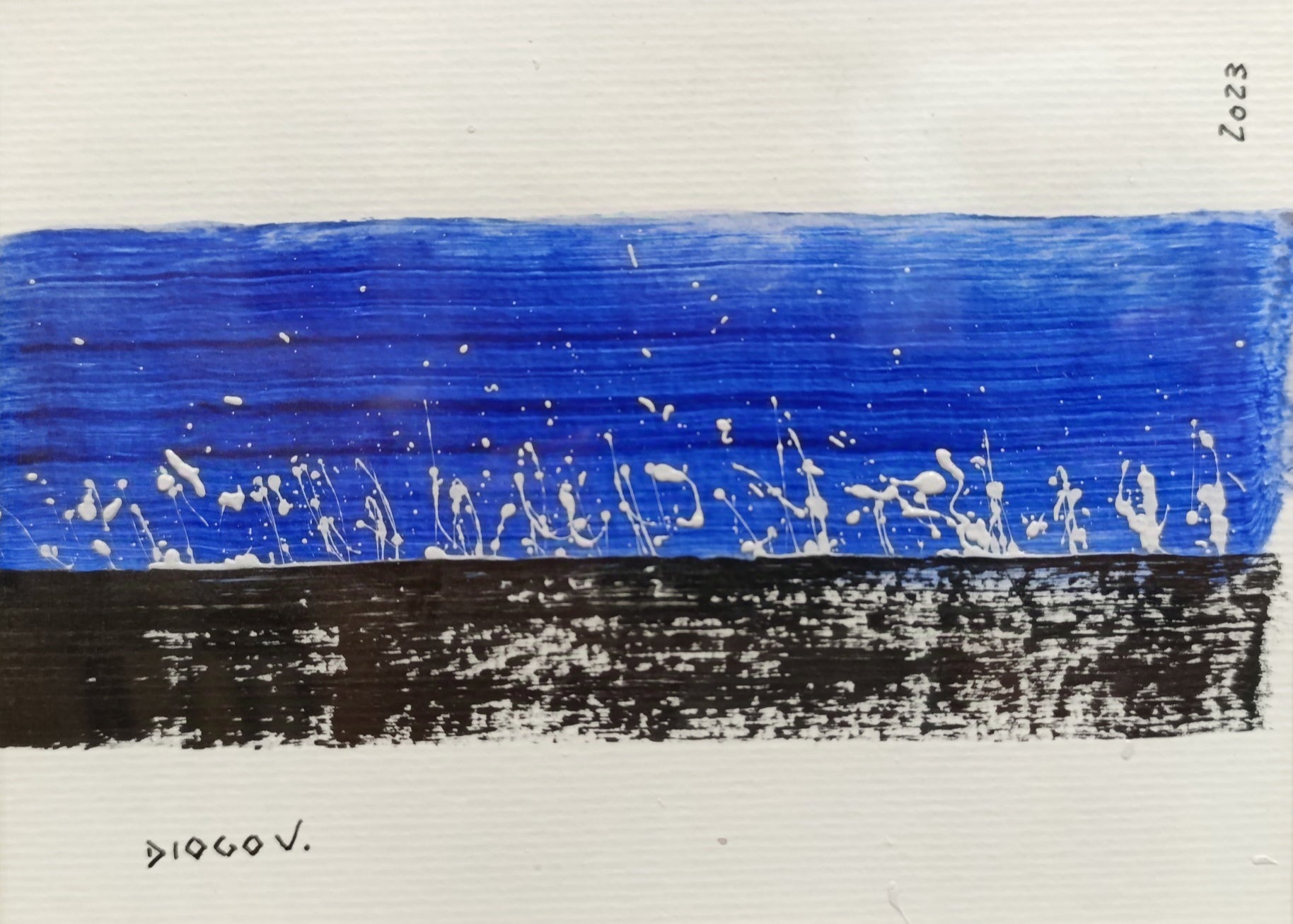 This striking abstract piece that shows the simplicity of white against a deep blue background to evoke a sense of nocturnal tranquility and the rhythmic beauty of nature. The white splatters and strokes across the canvas suggest a lively gathering of ethereal forms, perhaps evoking a scene of night birds at a serene lake or stars scattered across the night sky. The contrast between the intense blue and stark black creates a bold, visual impact, making this piece a powerful statement in any modern art collection.