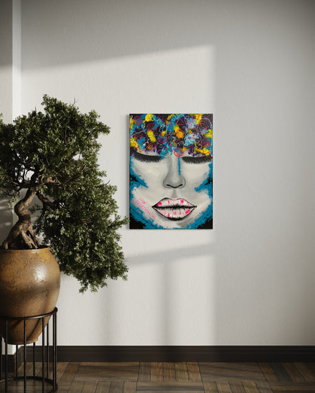 This piece presents a close-up of a woman's face, focused on her closed eyes and full lips, against a chaotic backdrop of vibrant, abstract graffiti.