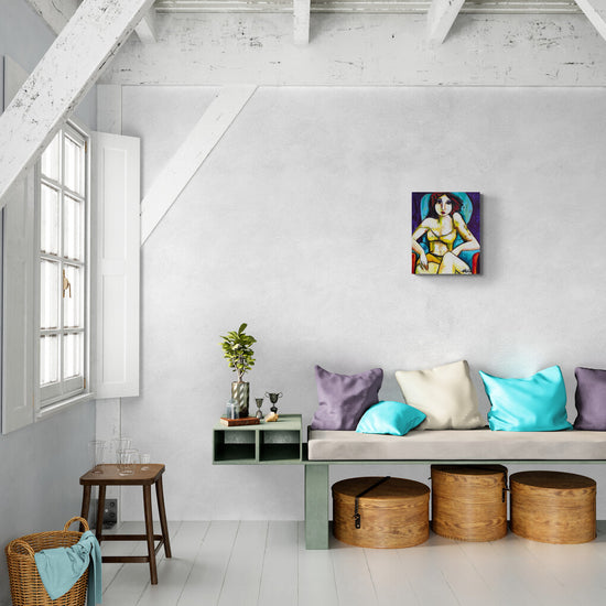A vibrant portrait of a woman sitting in a blue-green chair. She wears a yellow dress, with brown hair cascading over her shoulders. Her expression is soft and contemplative, with vivid colors and expressive features showing a cubist influence.