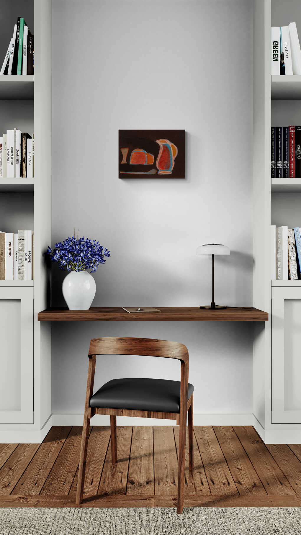 A contemporary take on still life, featuring stylized objects against a stark background. The use of bold colors and simplified forms brings a modern twist to traditional subject matter, creating a visually striking and thought-provoking piece.