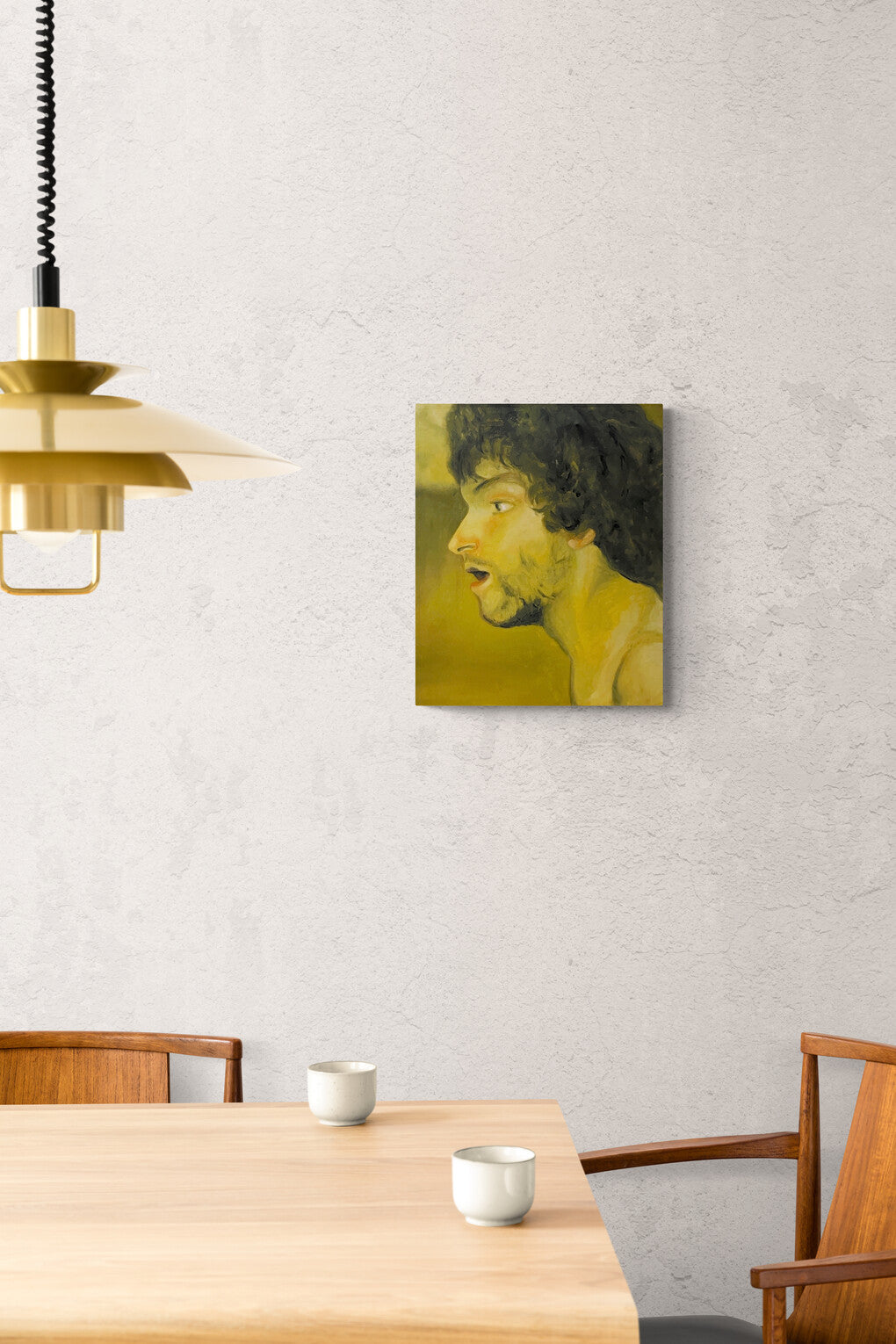 This painting depicts a side profile of a young man with curly hair. His expression is one of surprise or shock, with his mouth slightly open and eyes wide. The background is a muted yellow, giving a warm but intense atmosphere to the piece. The use of light and shadow on the man's face adds depth and emotion to the portrait.