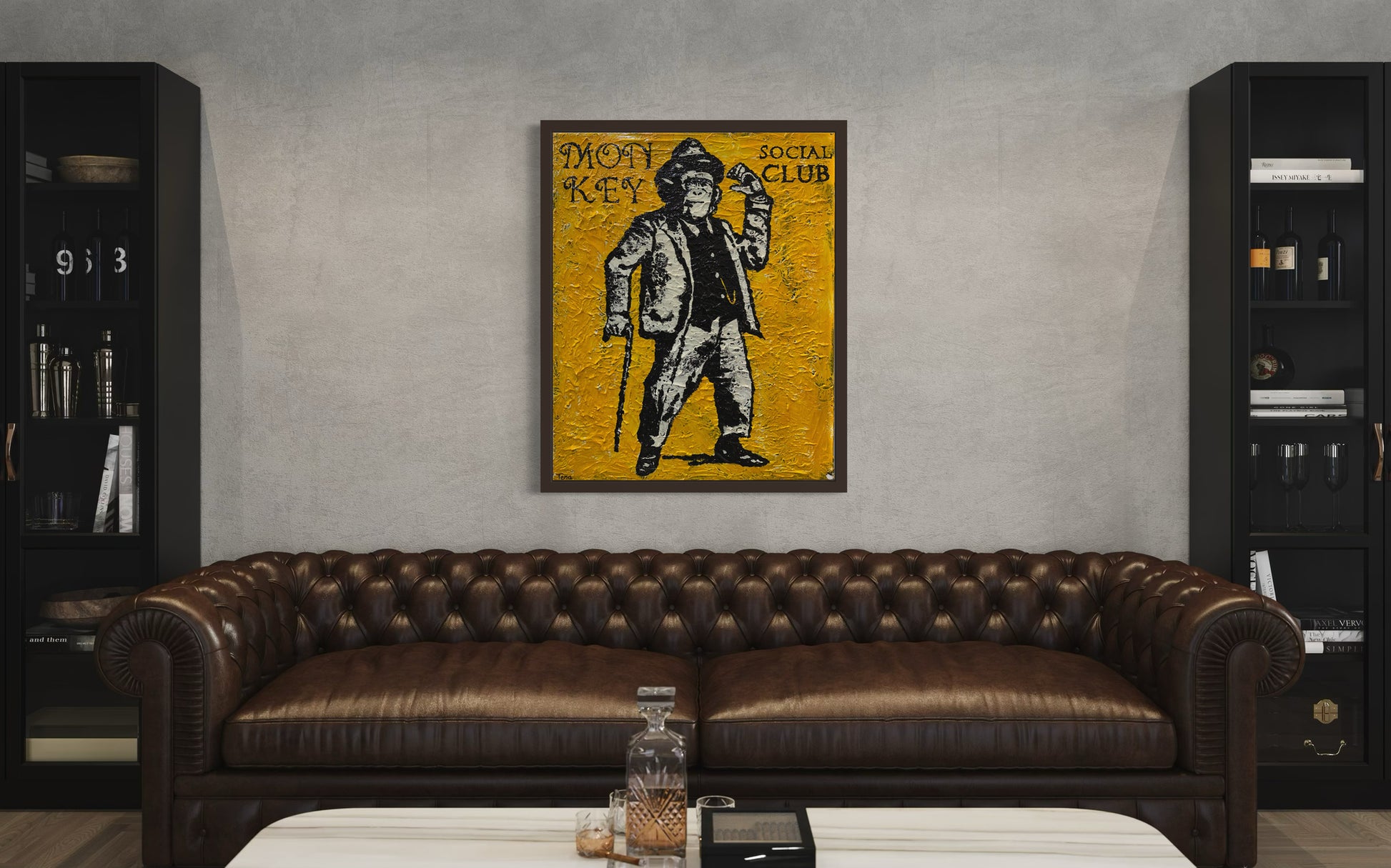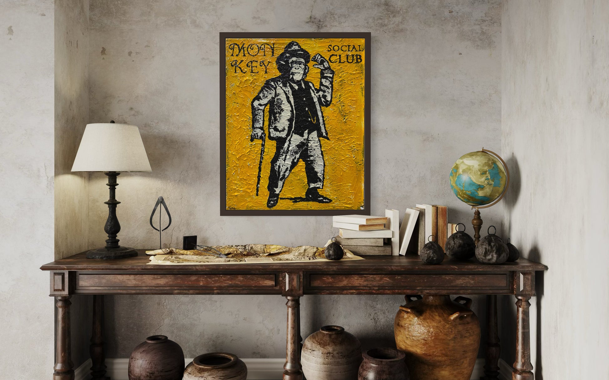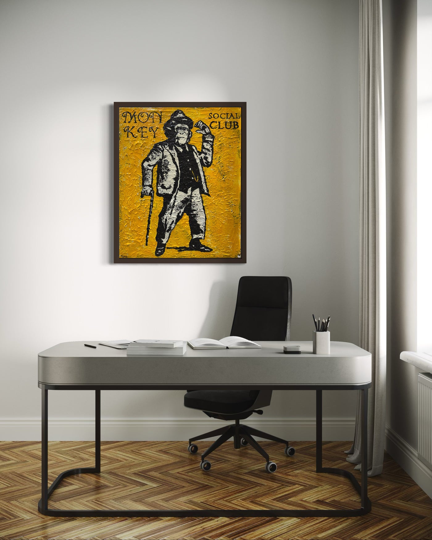 A whimsical portrayal of a dapper monkey in formal attire set against a heavily textured, vibrant yellow background, offering playful commentary on social dynamics.