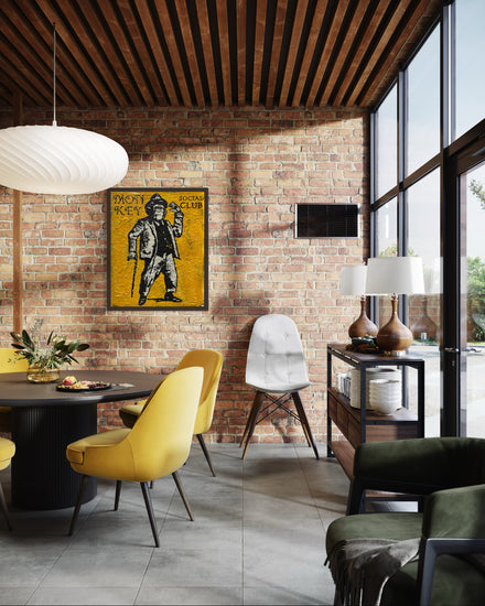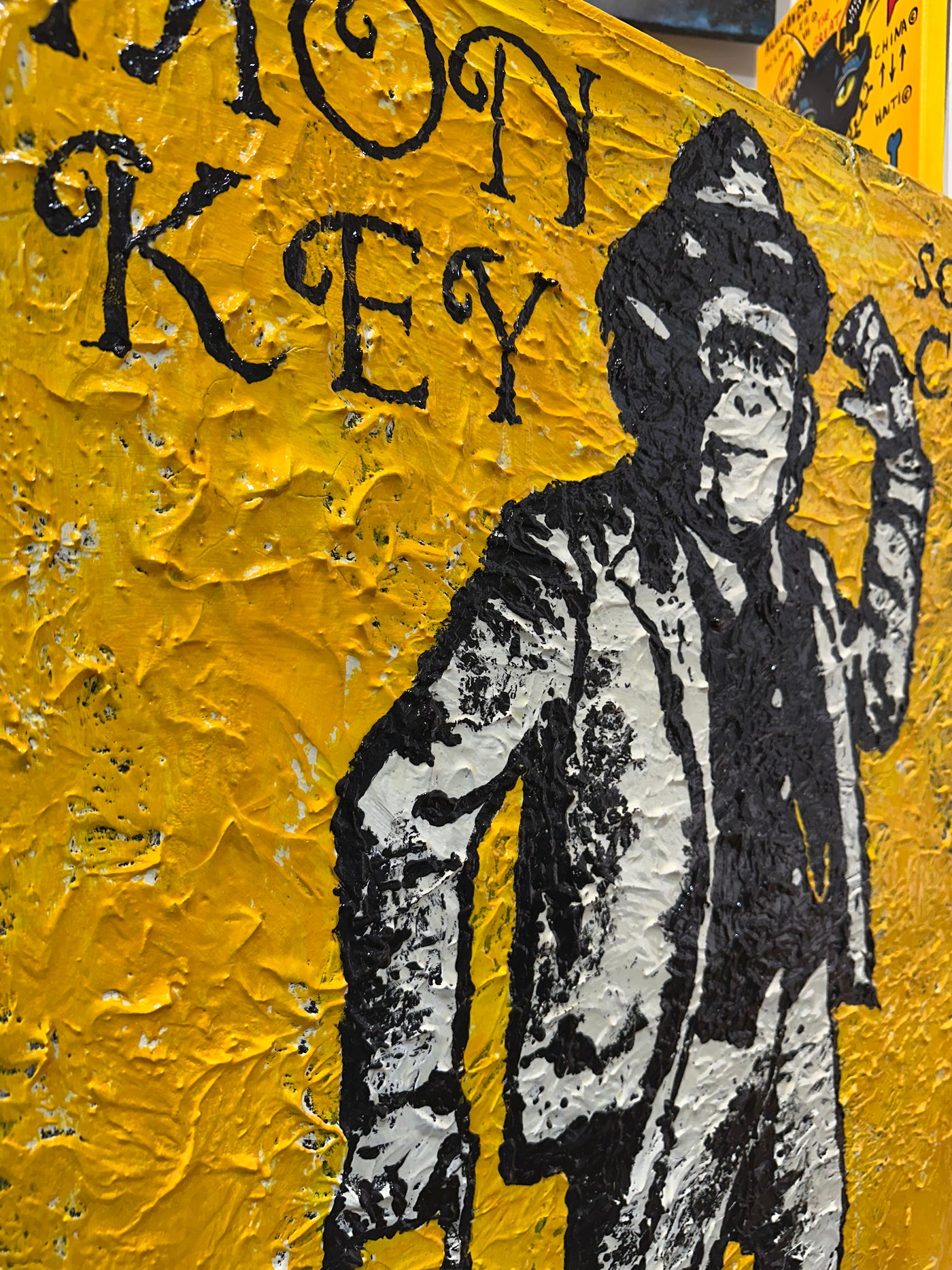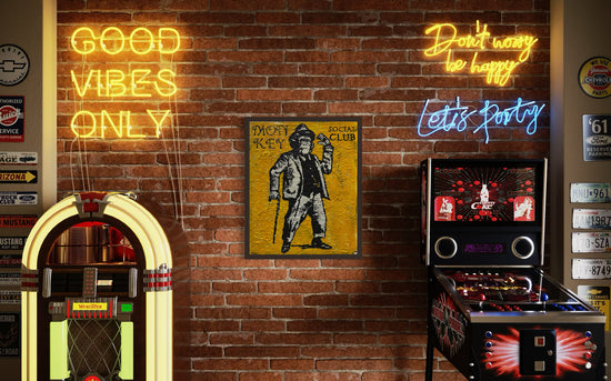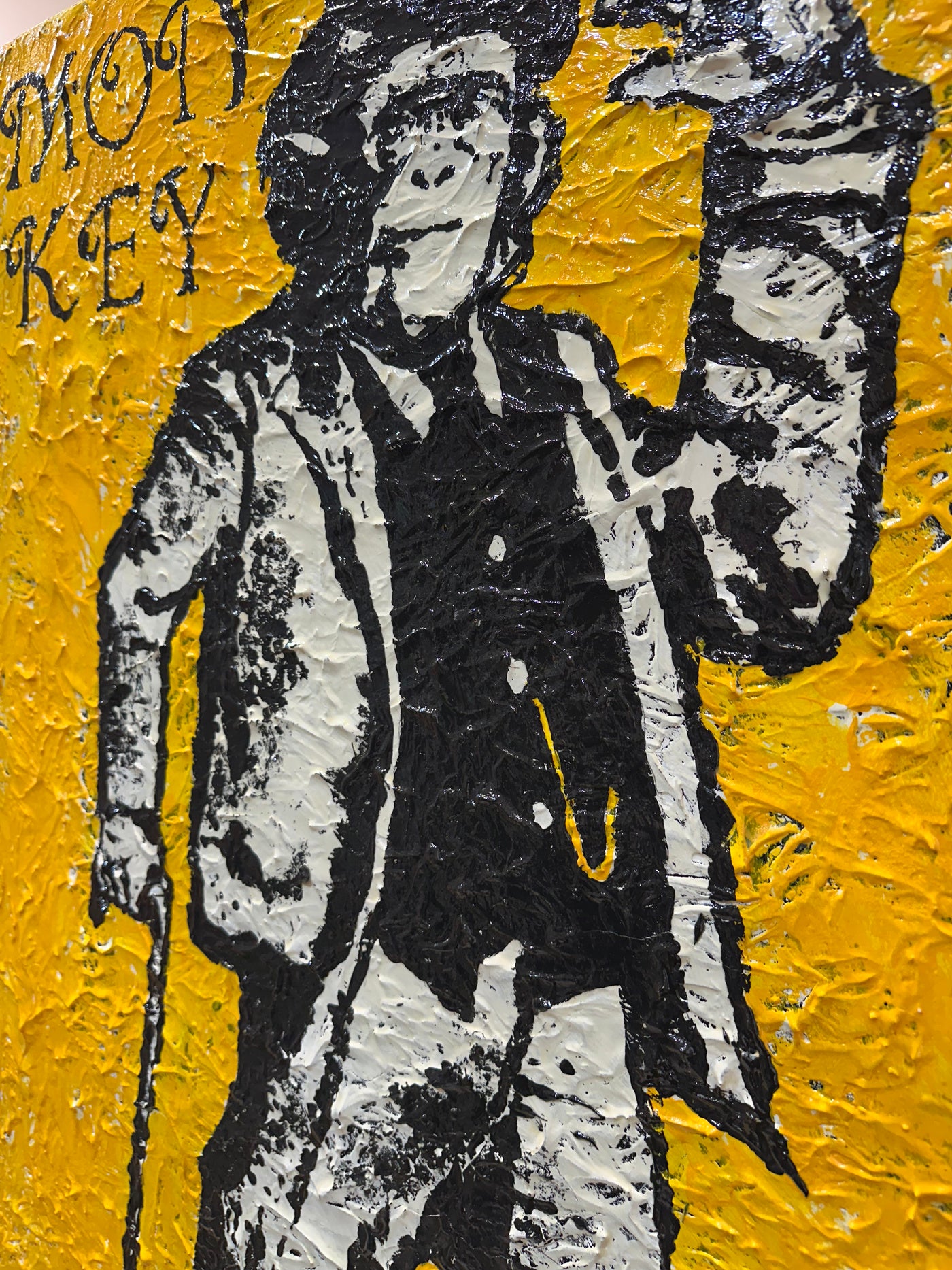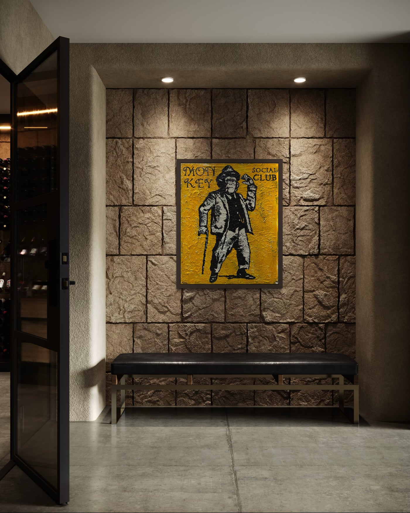 A whimsical portrayal of a dapper monkey in formal attire set against a heavily textured, vibrant yellow background, offering playful commentary on social dynamics.