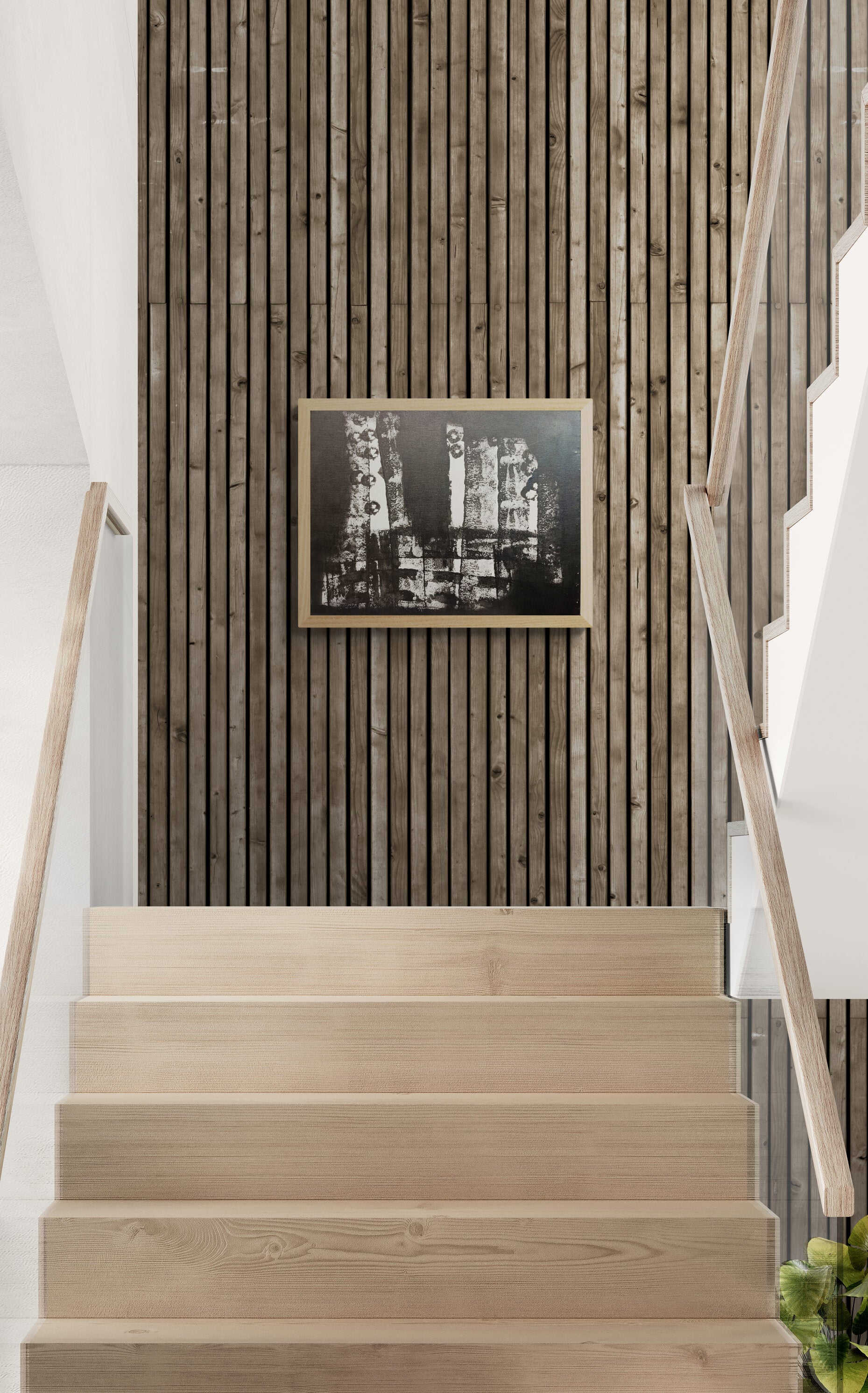Third piece in his monochromatic series reflects his consistent focus on abstract expression through black and white compositions. This particular piece employs textured vertical columns that contrast with areas of negative space, creating a dialogue between form and emptiness. The circular forms that appear intermittently add an organic touch to the geometric structure, evoking both natural and architectural associations. The combination of texture and composition draws viewers into a reflective exploration of balance and repetition.