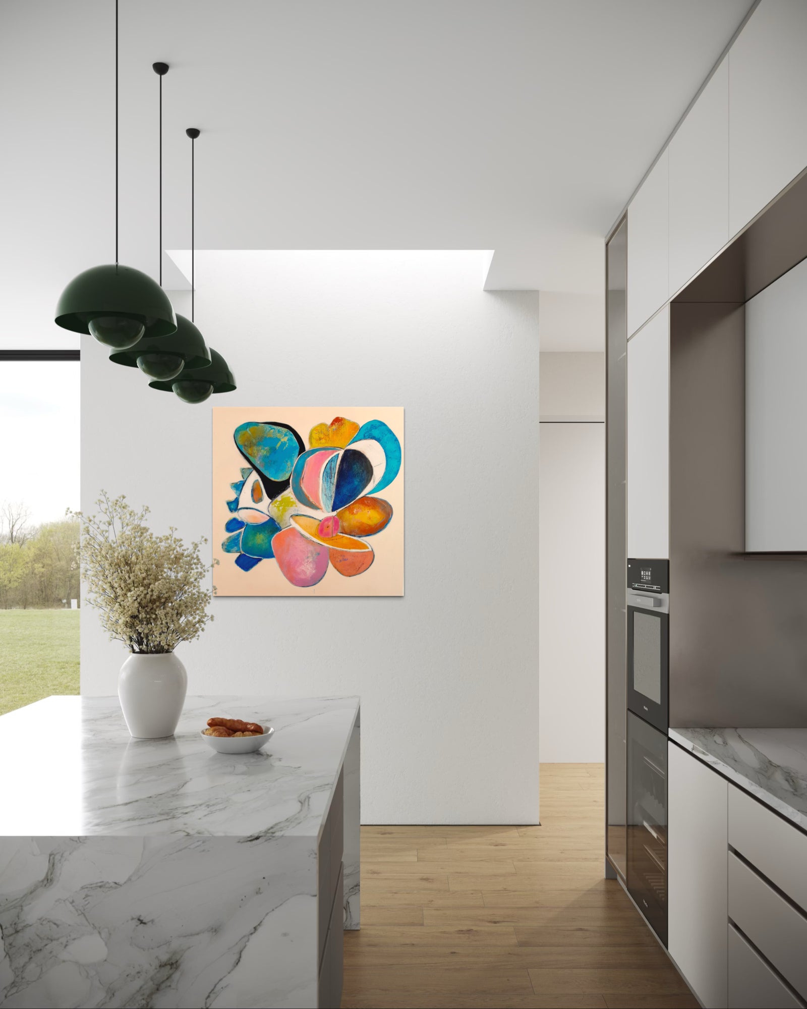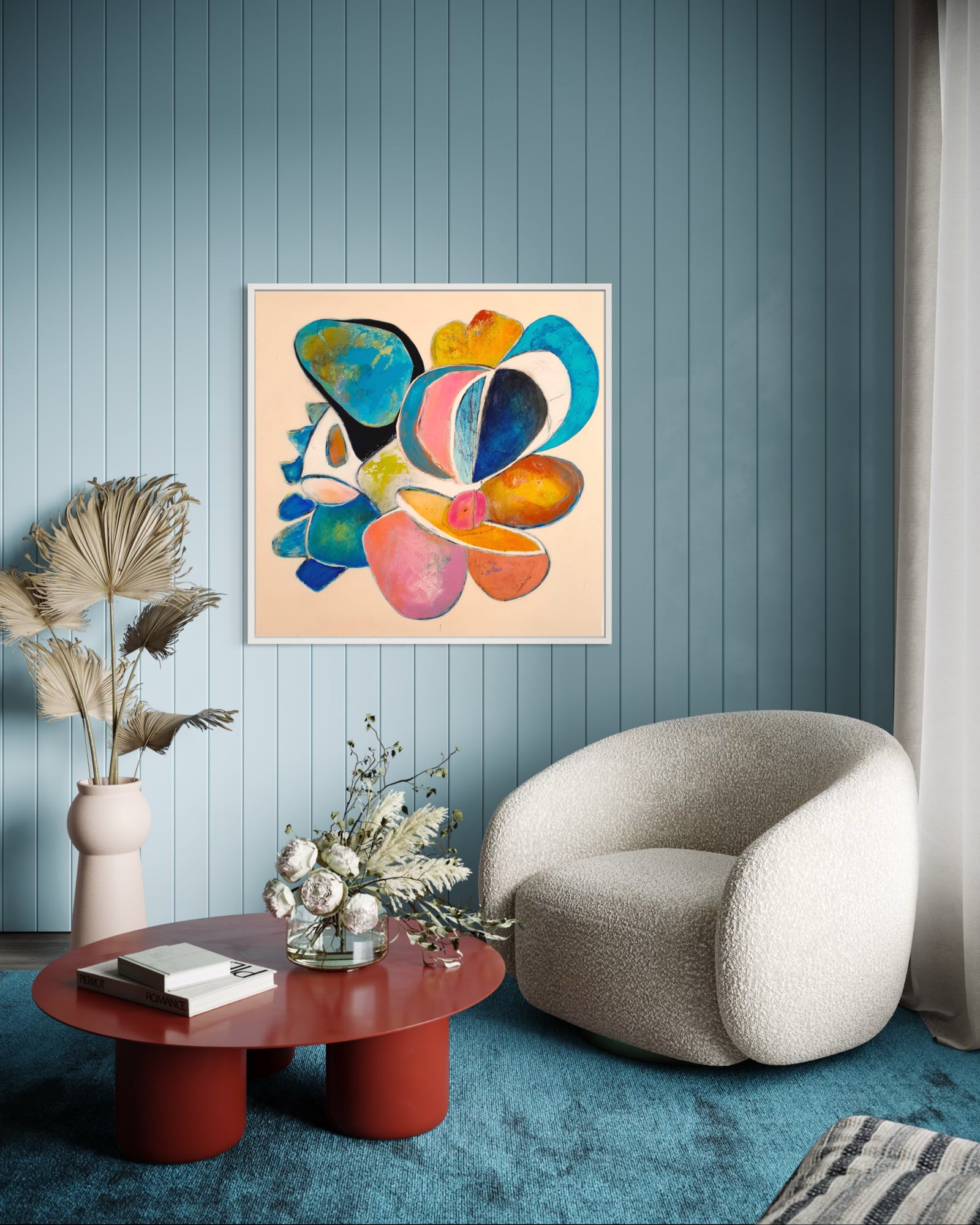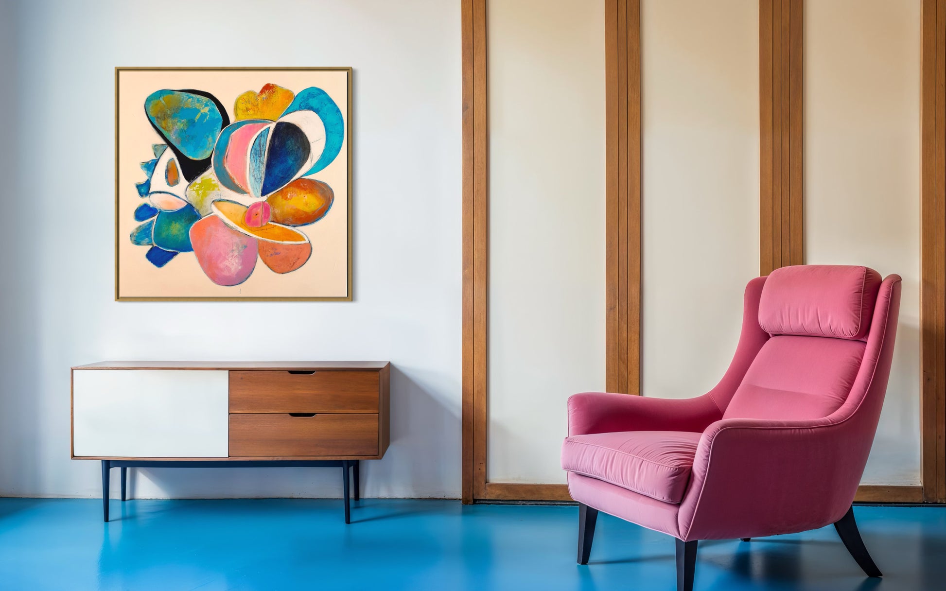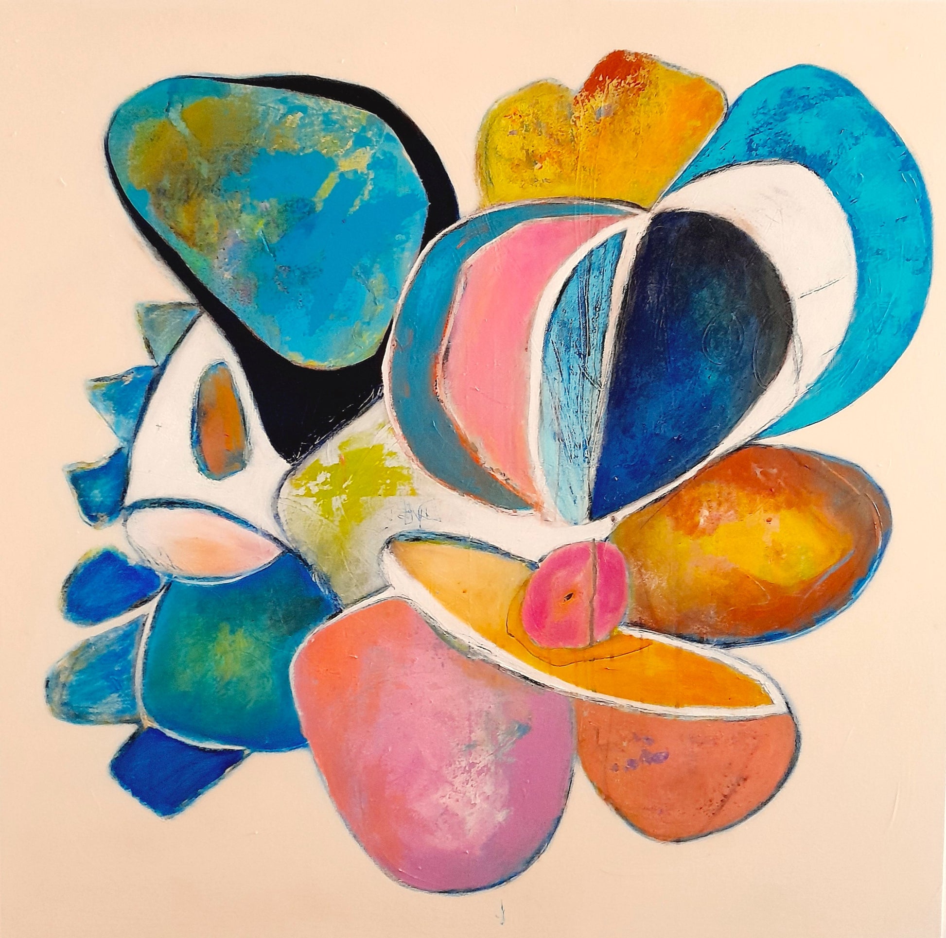 Soft yet vibrant, Moonlight Stories IV evokes dreams told under the glow of the moon. Layered shapes in blues, pinks, and ochres create a floating narrative — open to interpretation, but deeply felt.