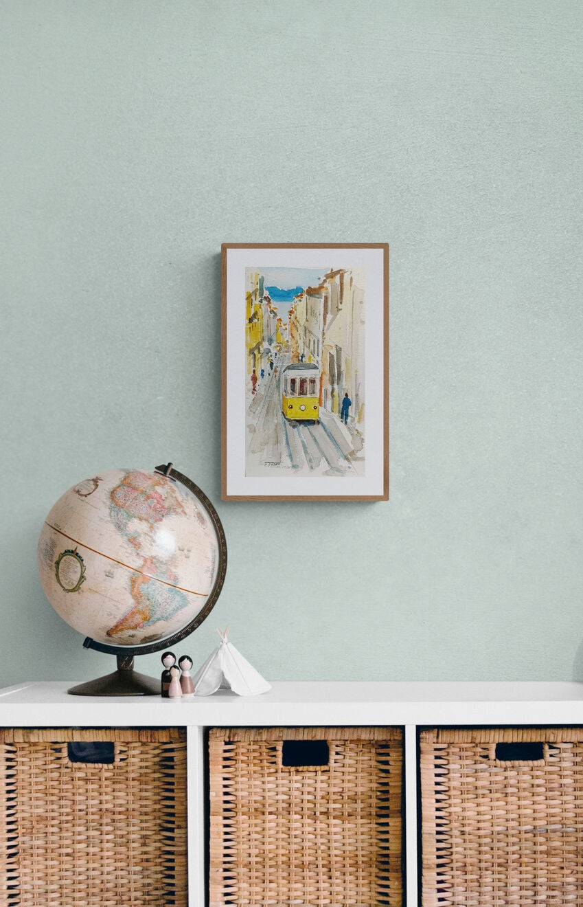 Morning Commute" is a charming watercolor painting that captures a quaint and bustling street scene featuring a classic yellow tram. The painting is rendered in an impressionistic style, focusing on the play of light and color to evoke a sense of early morning vitality. Splashes of vibrant yellow and subtle blues highlight the tram and the distant sea, contrasting beautifully with the earthy tones of the cityscape. This piece perfectly encapsulates the rhythm of daily urban life, making it a delightful addition to any collection.