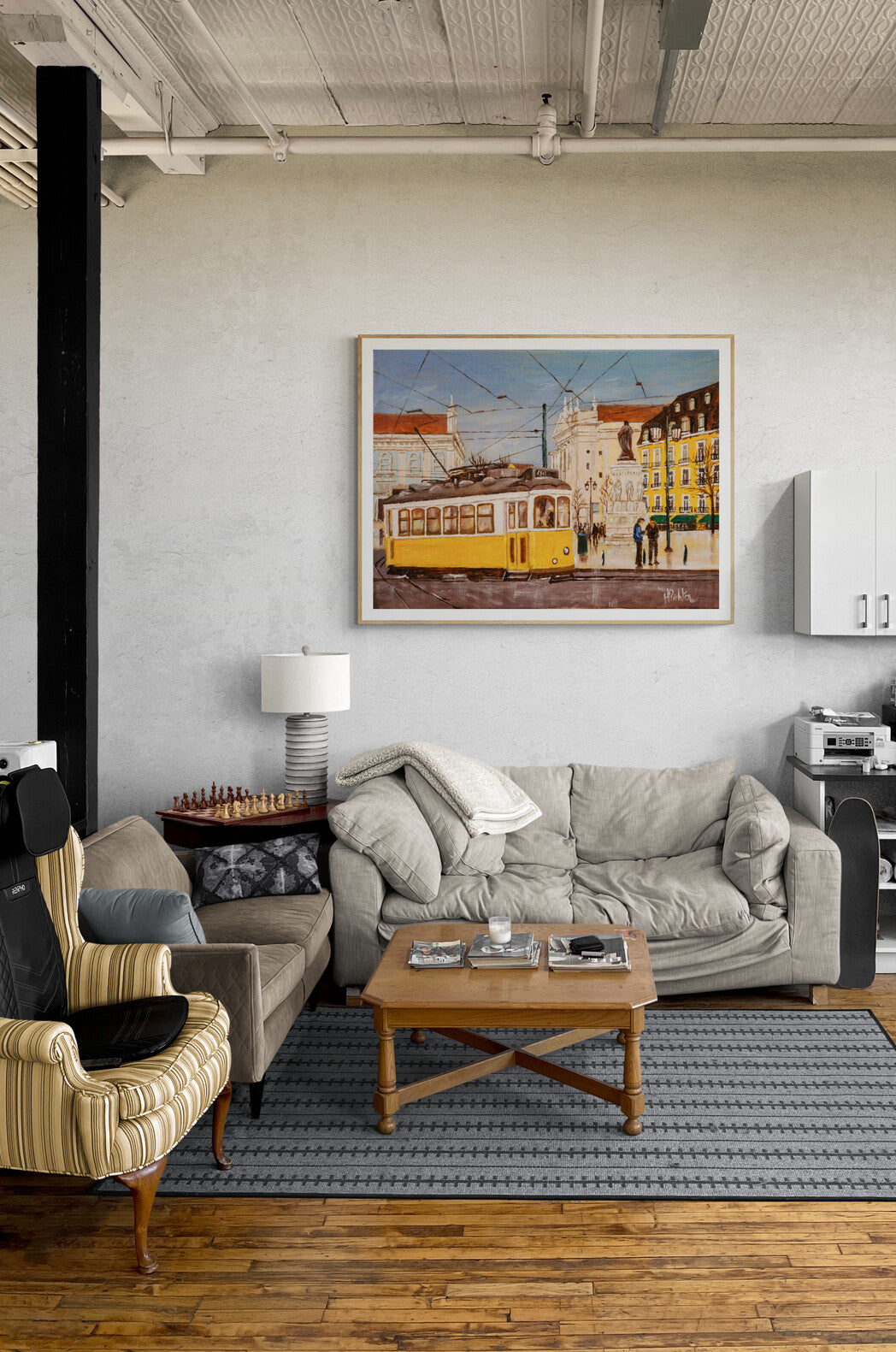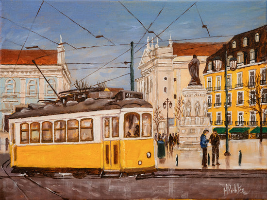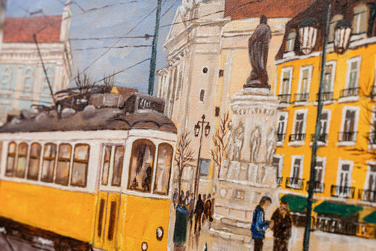 "Morning in Lisbon" portrays the lively essence of Lisbon with its iconic yellow tram gliding through a historic square, surrounded by classic architecture and the gentle hues of morning. The painting captures a moment of daily life, with pedestrians mingling and the city waking up. The artist's skillful use of light accentuates the vivid colors of the buildings and the dynamic sky, conveying a sense of movement and the vibrancy of urban life. This piece beautifully encapsulates the charm and heritage of Lisbon, making it a captivating window into the soul of the city.