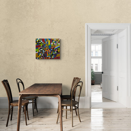 This artwork is a vivid mosaic of geometric shapes and colors, with a variety of squares and rectangles in bright hues of red, blue, green, yellow, and more. The intricate arrangement of shapes and the interplay of colors create a lively and energetic composition, reflecting the complexity and vibrancy of life.