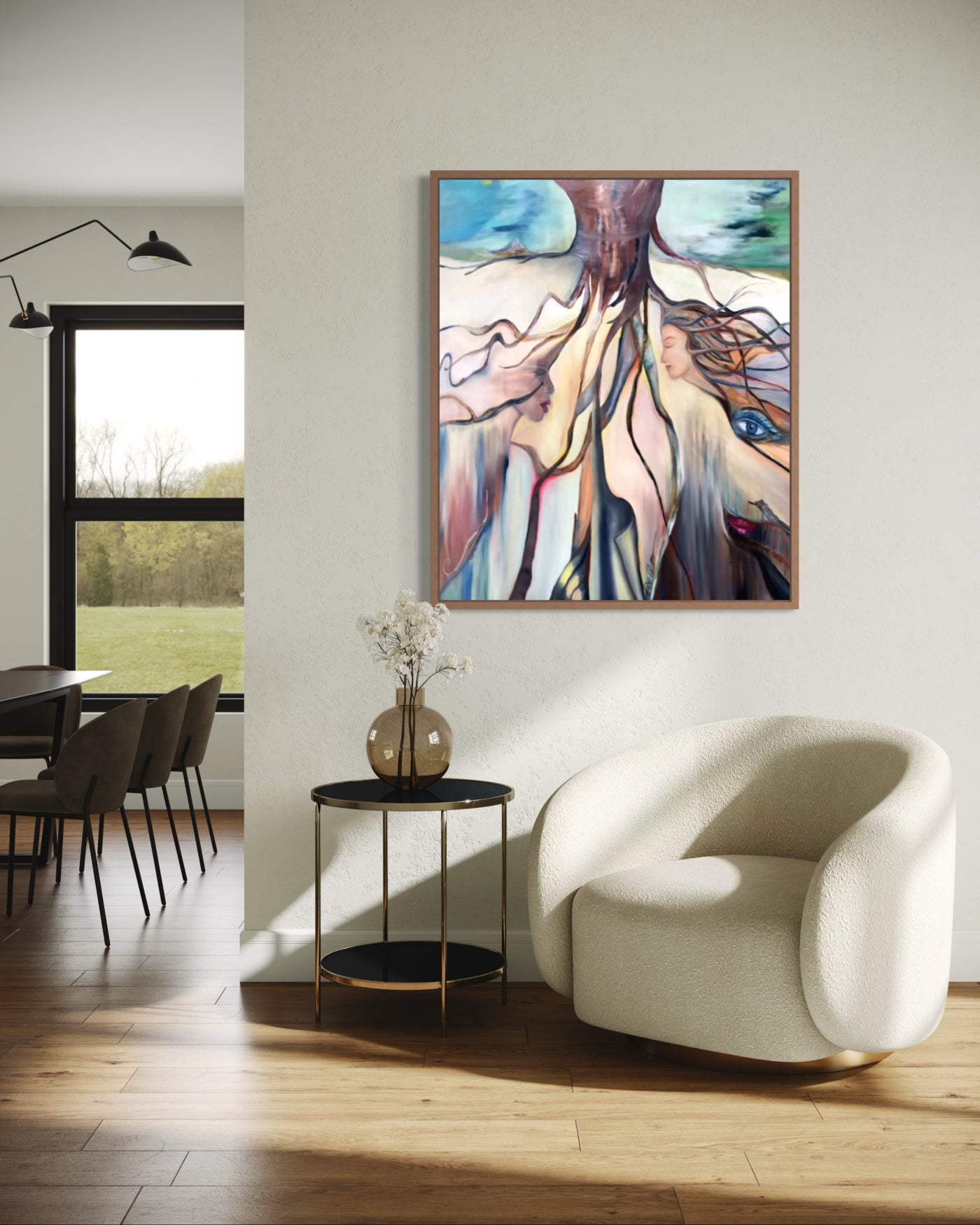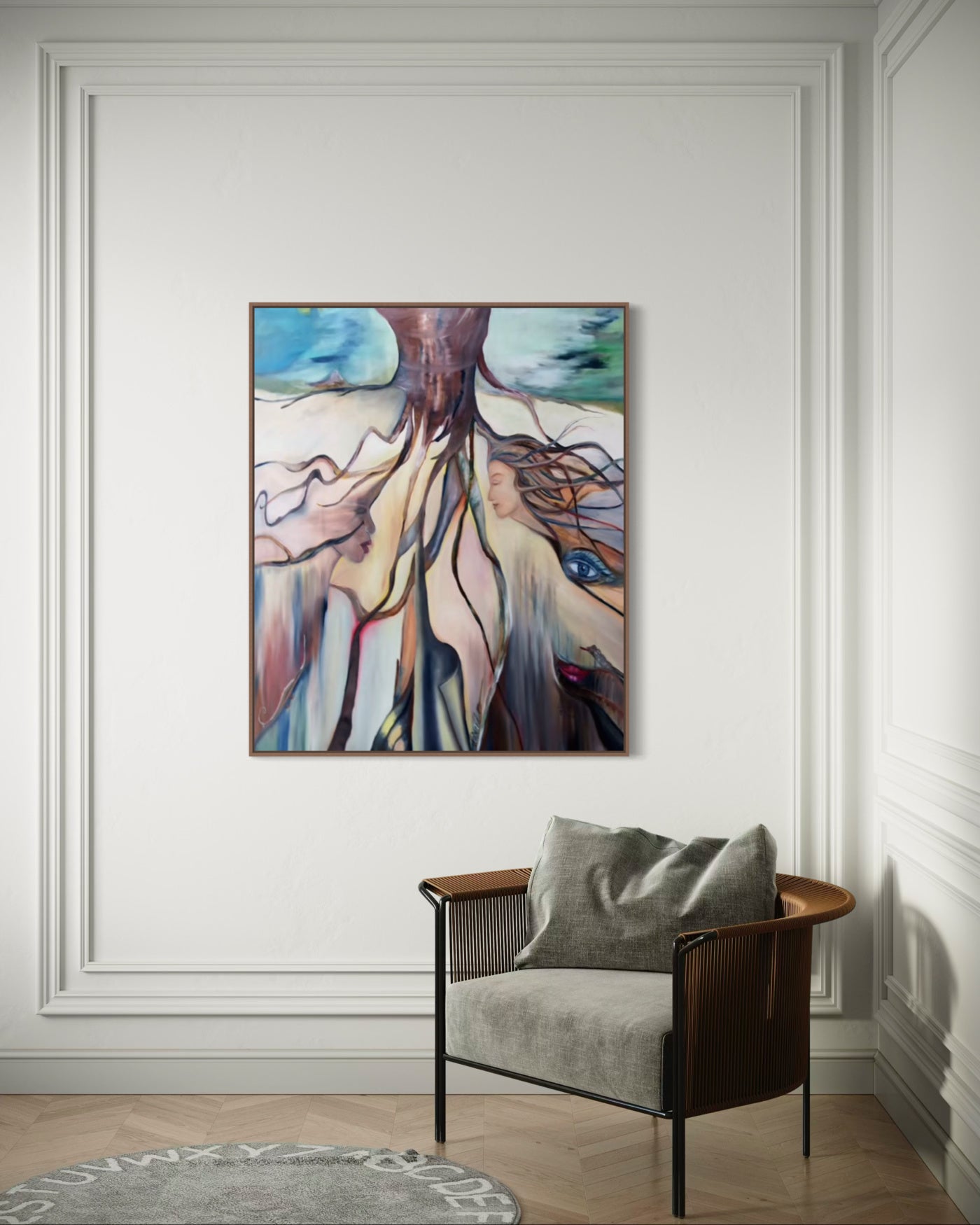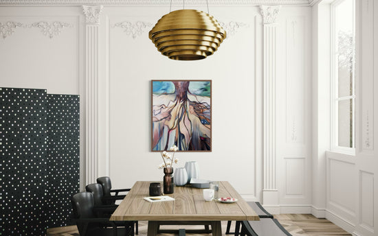 A powerful visual meditation on the interconnectedness of nature and humanity, this surrealist painting transforms the roots of a grand tree into flowing, organic forms that reveal faces, eyes, and lips—symbols of life, memory, and spirit.