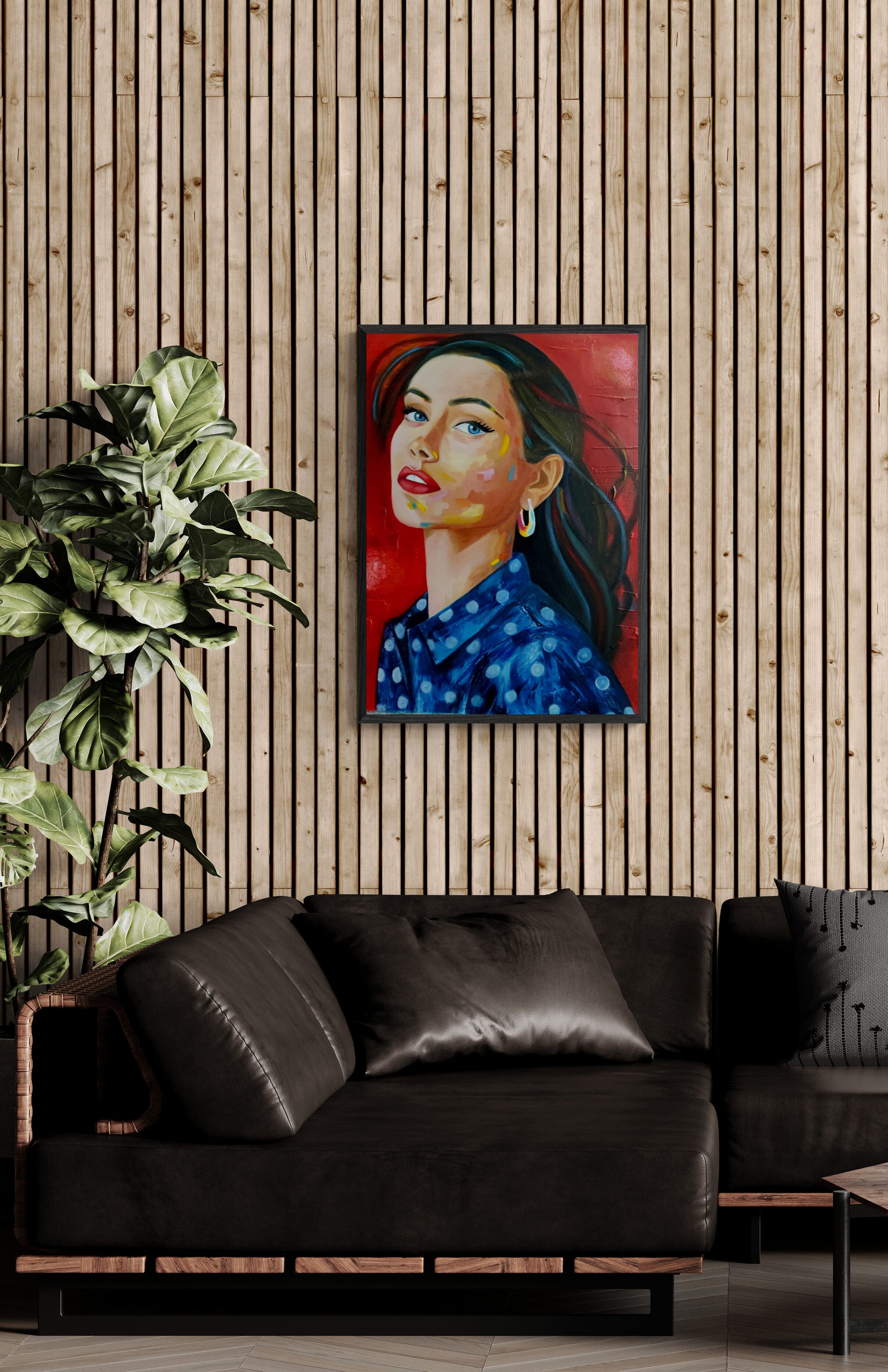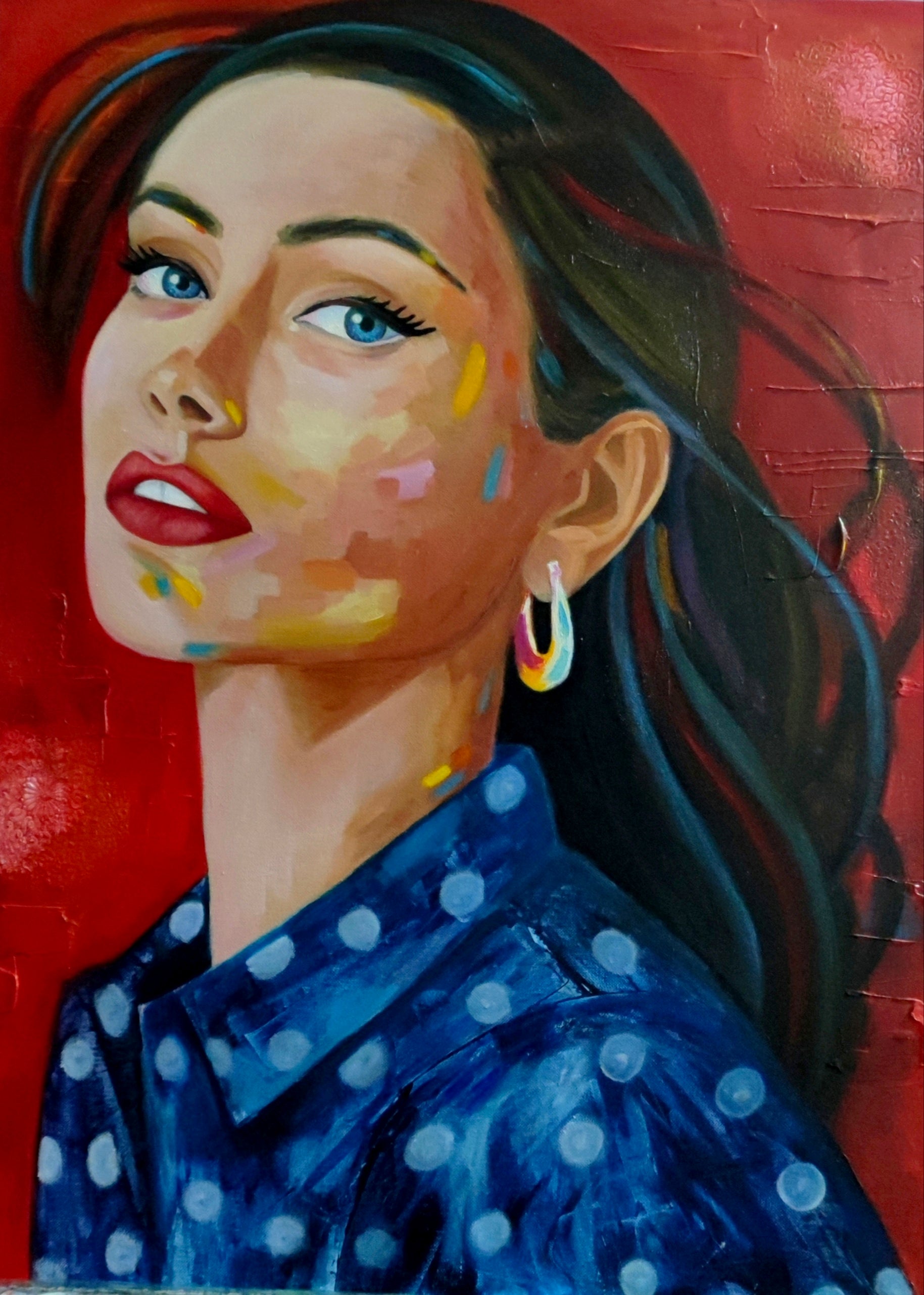 This portrait captures the poise and confidence of a young woman dressed in a blue polka dot shirt, set against a vibrant red background. The artist has applied colorful highlights on her face, adding a playful and modern twist to the classical portraiture. Her piercing blue eyes and red lips exude confidence and sophistication, while the subtle interplay of light and color on her skin hints at a sense of inner strength. The minimalist background allows the subject to dominate the composition, making her captivating gaze the focal point of the piece.
