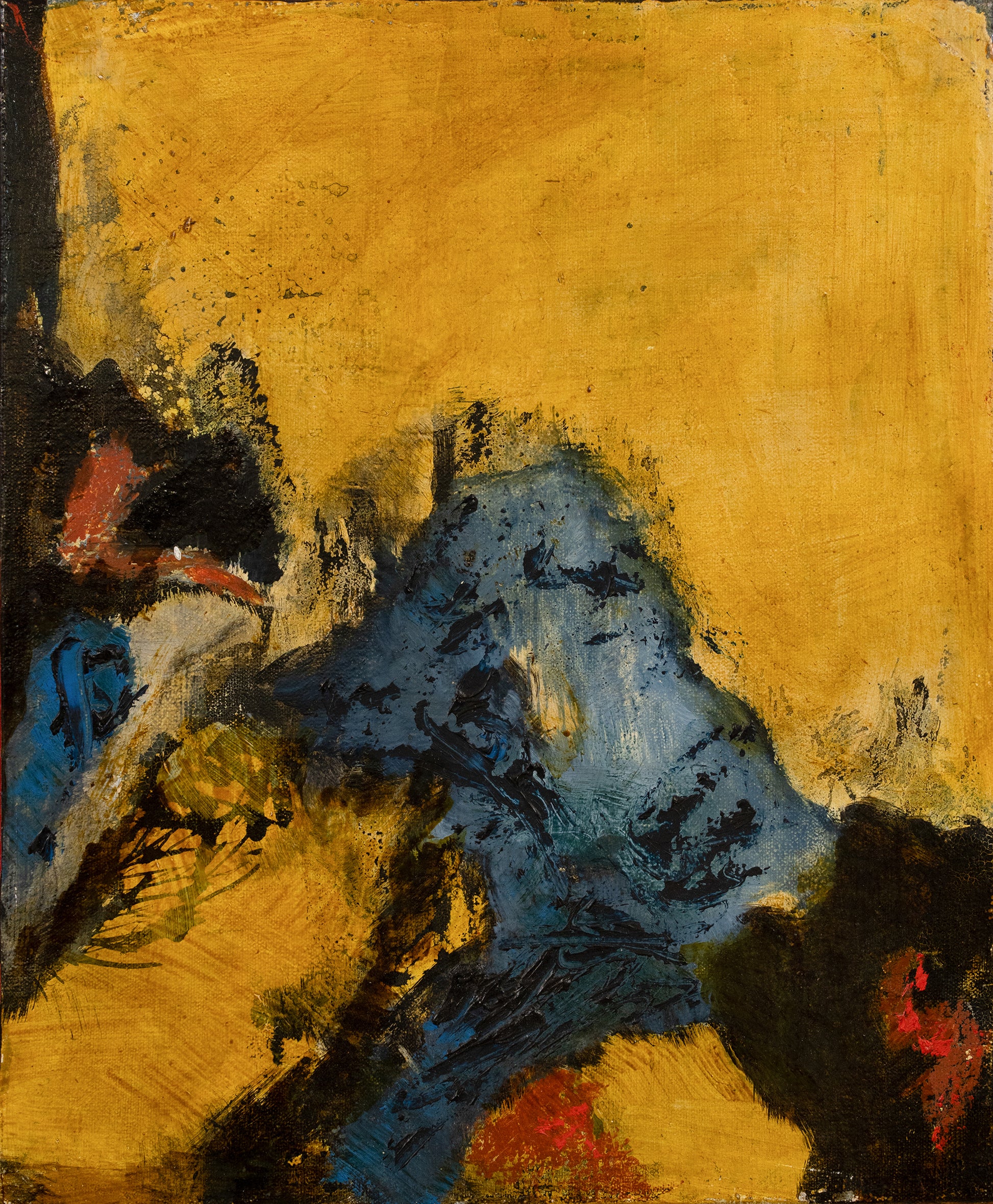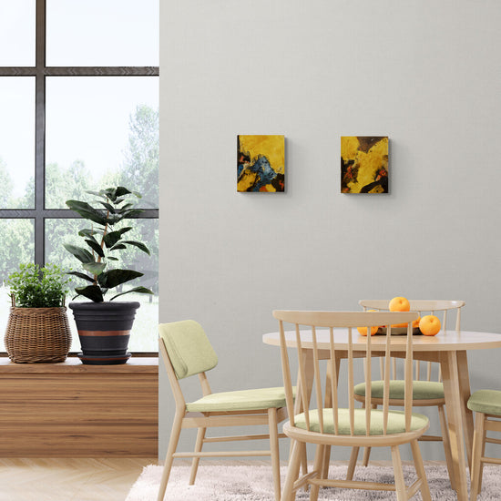 This abstract painting features a powerful interplay of colors and textures, evoking the rugged beauty of mountainous landscapes. Dominated by rich blues and deep blacks against a golden background, the composition suggests the raw, untamed essence of nature. The thick, expressive brushstrokes and layered textures convey a sense of depth and mystique, inviting viewers to explore the hidden stories within the mountains.
