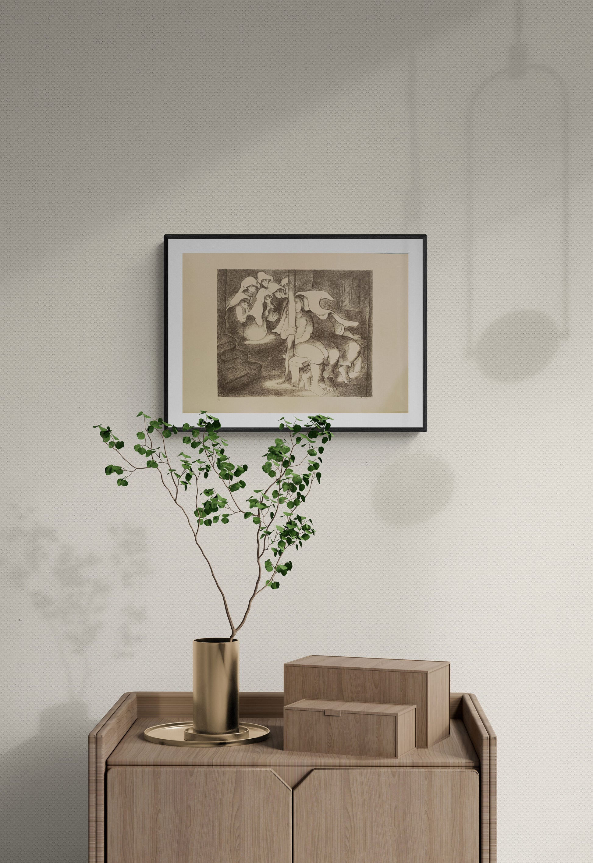 The women surrounding her appear deep in thought, their expressions conveying a quiet intensity. The soft light that filters through the room enhances the sense of stillness, focusing on the bond and shared experience of these women. The composition emphasizes both the solidarity of the group and the individual reflections of each figure. The scene evokes themes of waiting, contemplation, and unity in the face of unseen circumstances.