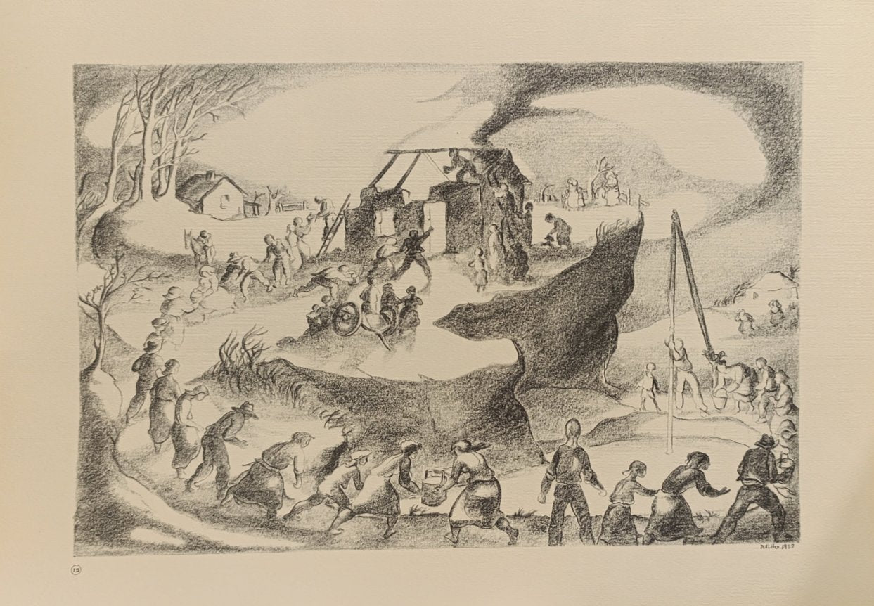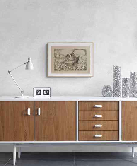 Set against a rural backdrop, this detailed composition illustrates a group of people engaged in building a structure, possibly a home or a barn. Men, women, and children are all participating in various tasks, from lifting materials to passing along tools, symbolizing the power of cooperation and shared labor. The natural surroundings, with bare trees and rolling hills, frame the scene, emphasizing the connection between human activity and the environment. The drawing’s flowing lines and dynamic figures convey a sense of movement and purpose.
