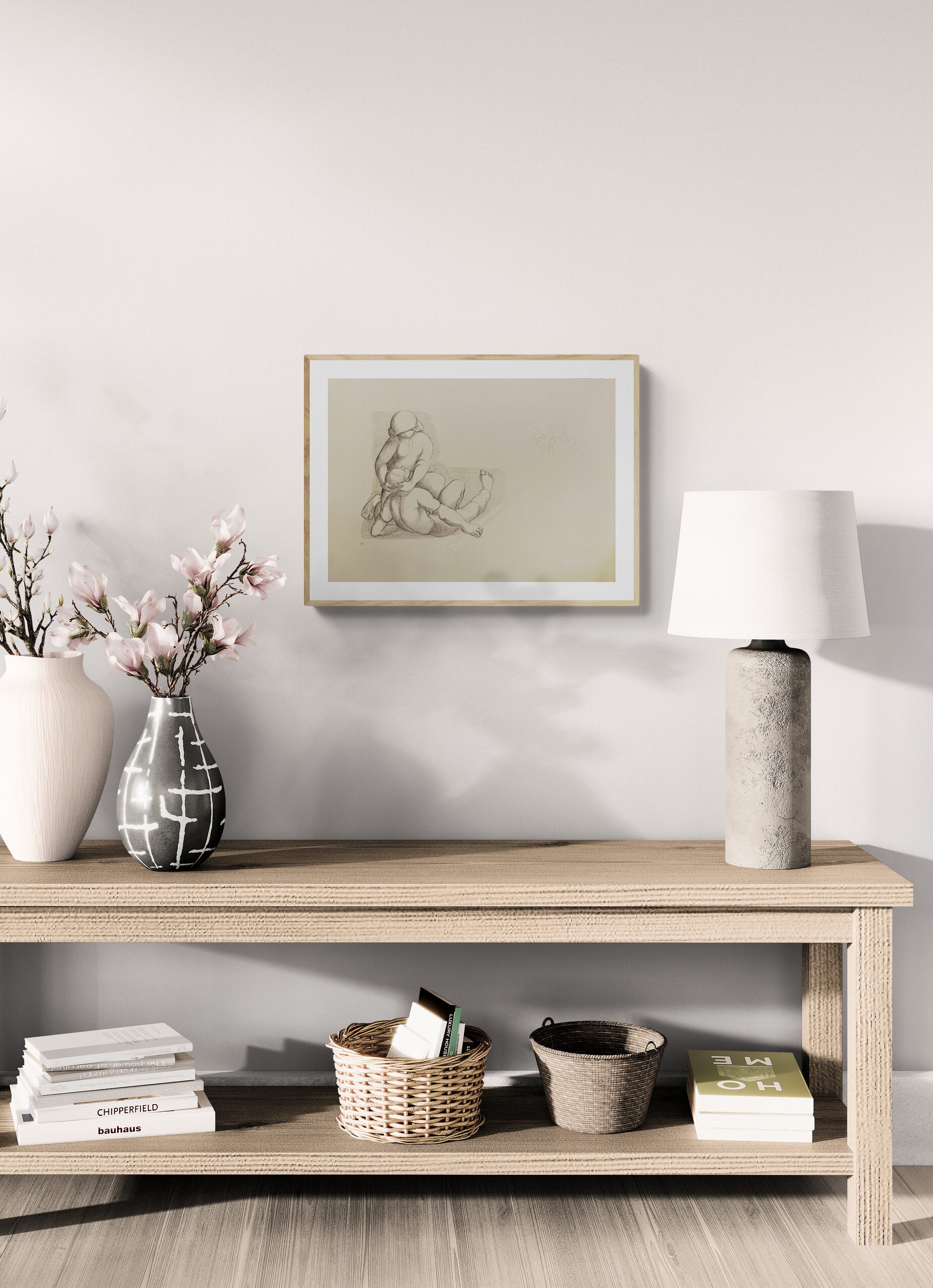 The soft, rounded forms of the figures, combined with the delicate shading, convey a sense of warmth and human connection. The larger figure’s hands gently cradle the head of the other, evoking a feeling of protection and care. The minimalist background draws attention to the closeness between the figures, emphasizing the emotional depth of the scene. A faint sketch in the corner hints at this theme of care, possibly suggesting the continuation of a nurturing bond.