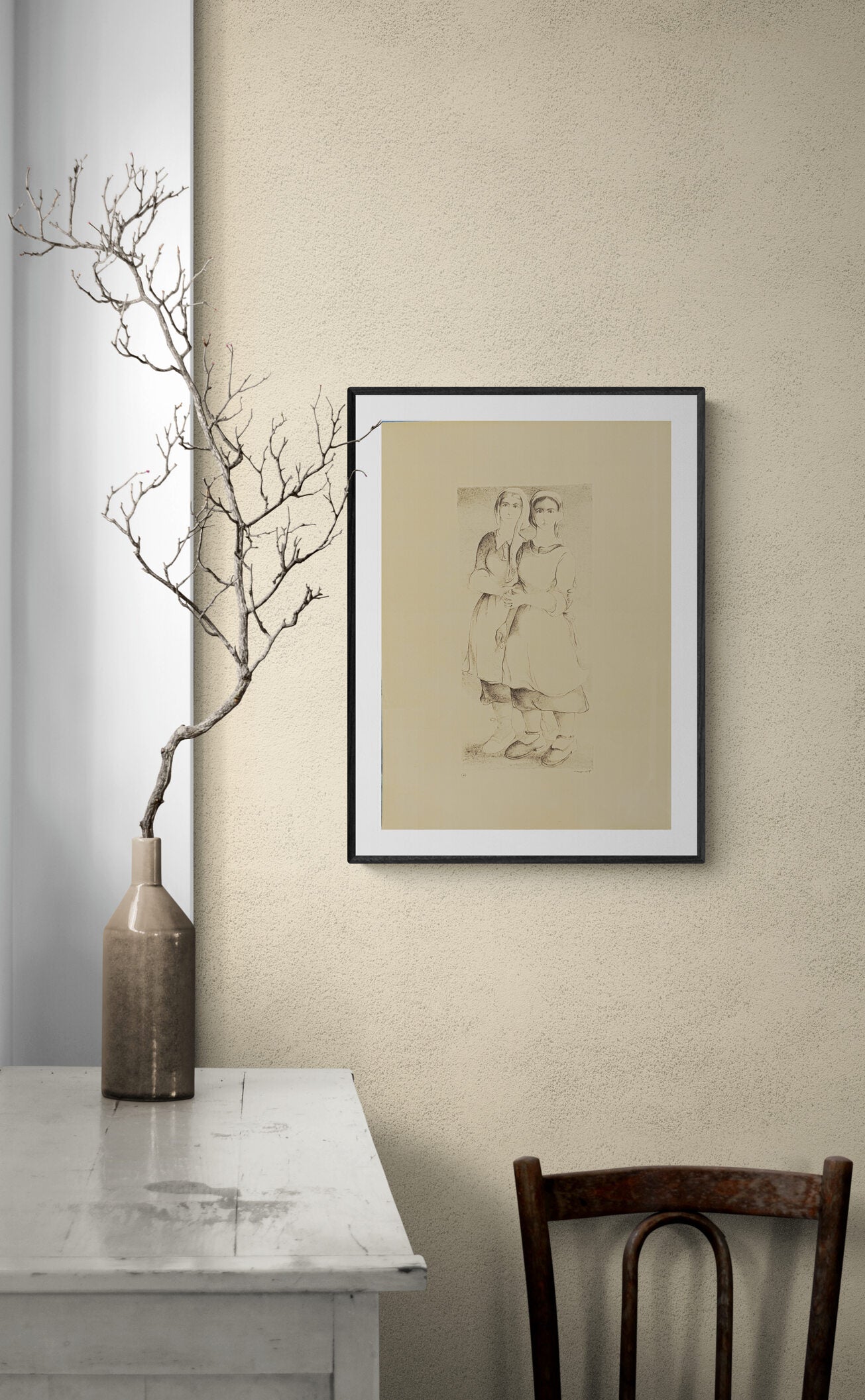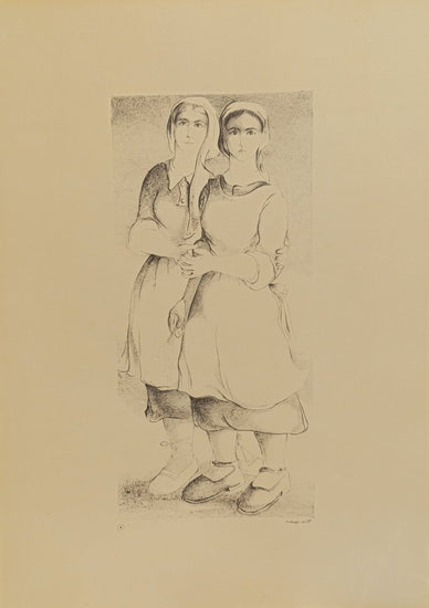 The quiet strength and unity of two young women, likely sisters, standing close to one another. Their simple yet sturdy clothing suggests a rural or working-class background, with one arm loosely wrapped around the other in a gesture of comfort and connection. Their faces, soft yet resolute, are turned toward the viewer with calm expressions, reflecting the strength of their bond. The drawing uses delicate shading and soft lines, emphasizing their unspoken support and solidarity in a world of modest means.