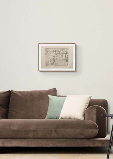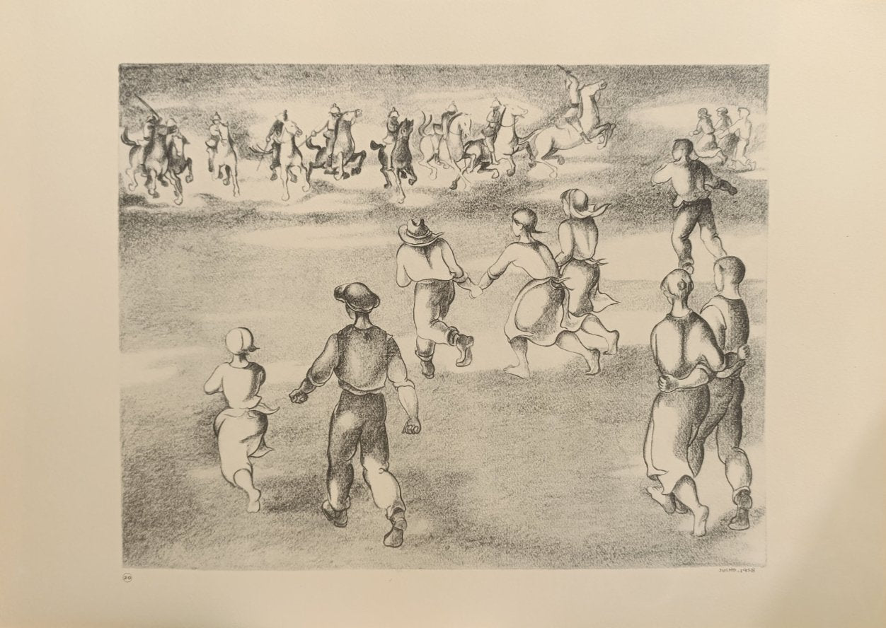 The figures in the foreground are depicted in light, flowing lines, their movements graceful and synchronized as they celebrate. The distant figures on horseback seem to leap in harmony with the celebrants on the ground, suggesting a shared joy and sense of freedom. The subtle shading and expansive composition evoke a sense of unity, liberation, and the power of communal celebration.