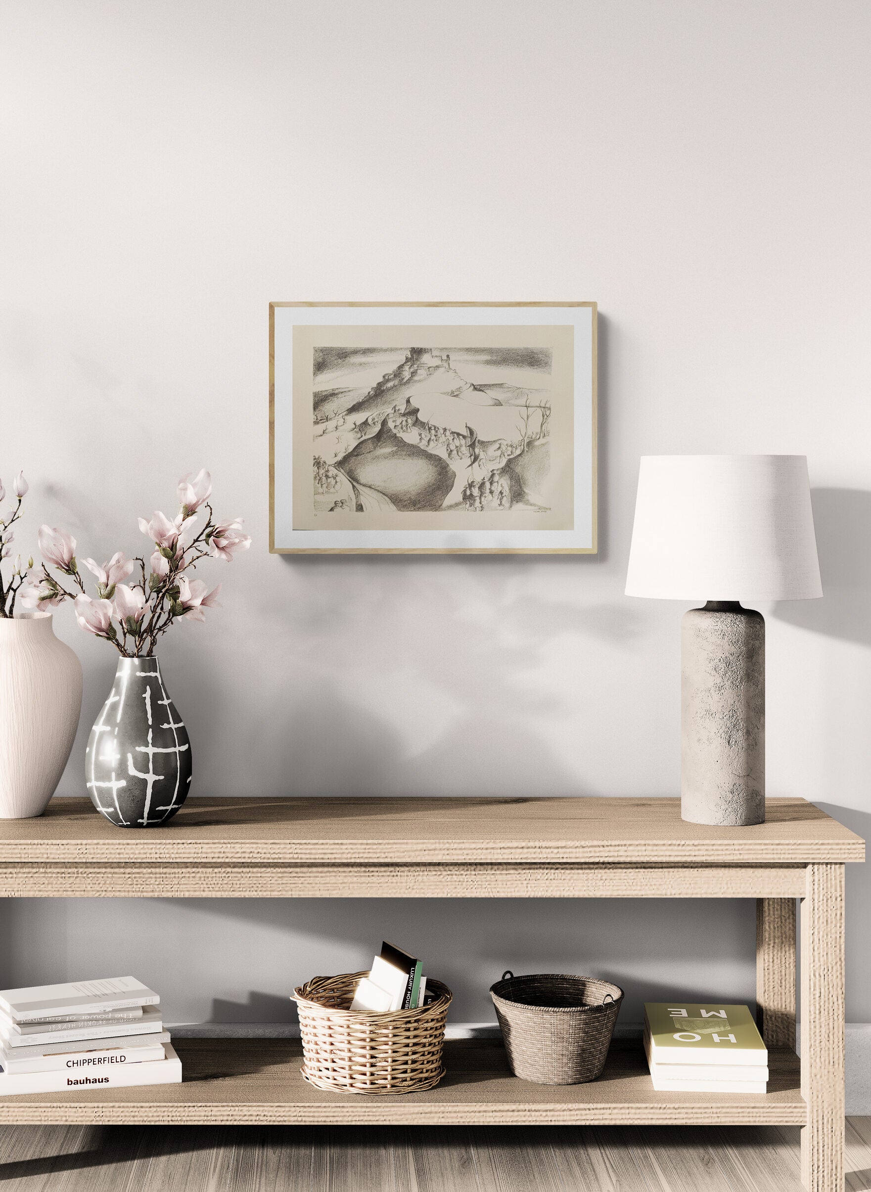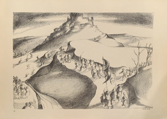 The artwork, titled "Julho 1958" (July 1958), referencing the collective movements or resistance during that era. The detailed shading and use of light and shadow give the landscape and figures a three-dimensional depth, making the scene more dynamic. This piece appears to reflect themes of perseverance, struggle, and perhaps political or social commentary on the period in which it was created.