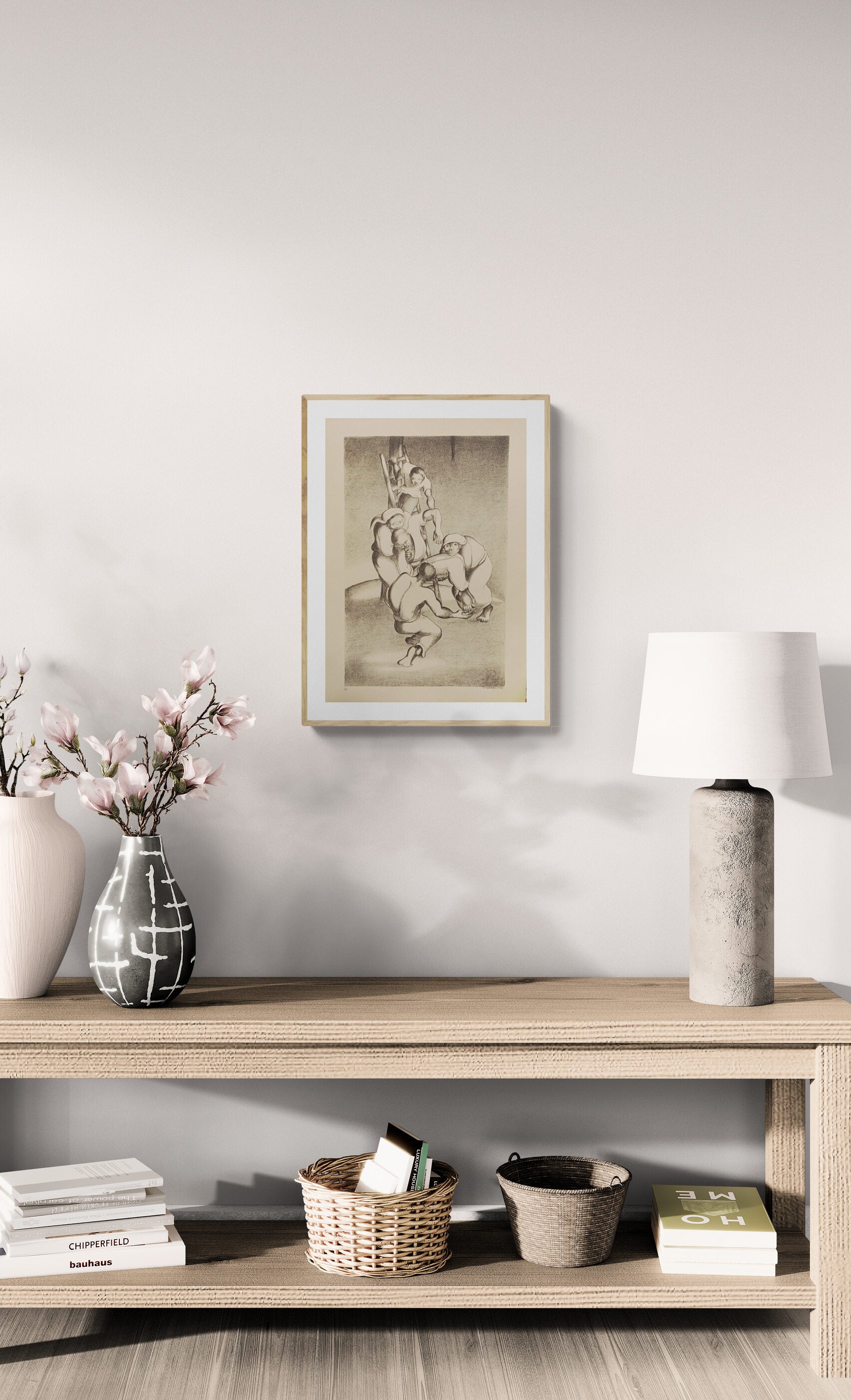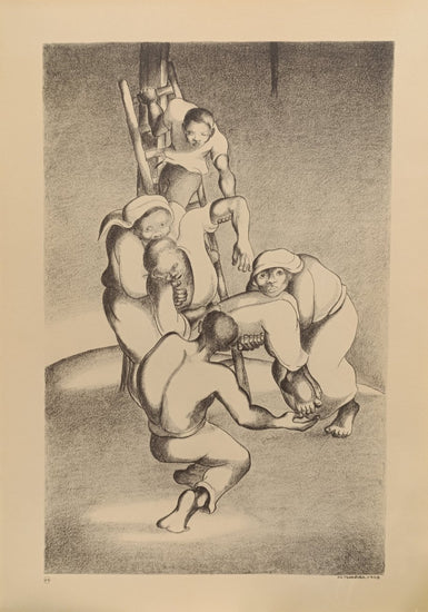 "September 1958" captures a powerful moment of unity and human strength. Depicted in monochrome, a group of individuals helps one another ascend a ladder, symbolizing collective effort and mutual support. Each figure is intricately rendered, with expressions of determination and care, highlighting the importance of community in overcoming challenges.