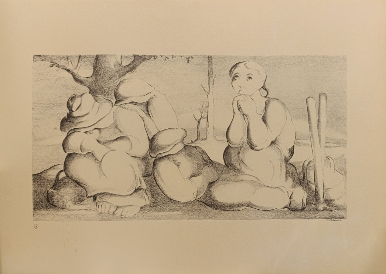 The composition reflecting a sense of fatigue after a long day. One figure, resting their chin on clasped hands, gazes thoughtfully into the distance. The others are seen with heads lowered, finding comfort in stillness. Farming tools rest by their side, reinforcing their connection to labor and the land. The composition uses soft shading and rounded forms to evoke a sense of peace and contemplation amidst hard work.