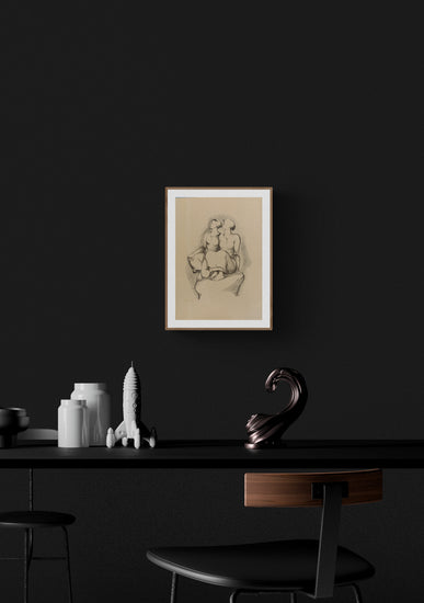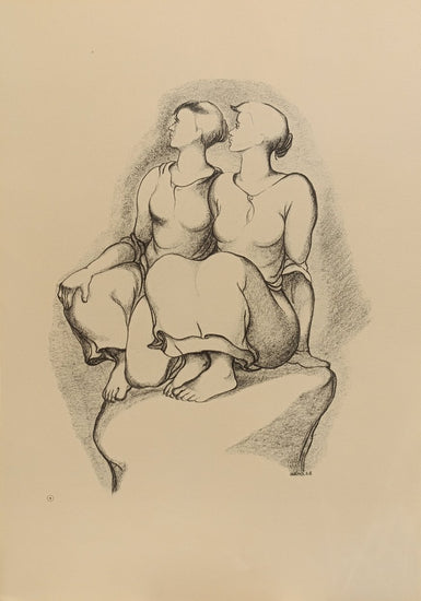 The figures are softly outlined, and the simplicity of their forms conveys a sense of calm and introspection. Their closeness to each other, sitting side by side on a stone-like platform, suggests a deep connection or shared experience. The composition focuses on the serenity of the moment, inviting viewers to join in the quiet contemplation of what lies ahead.